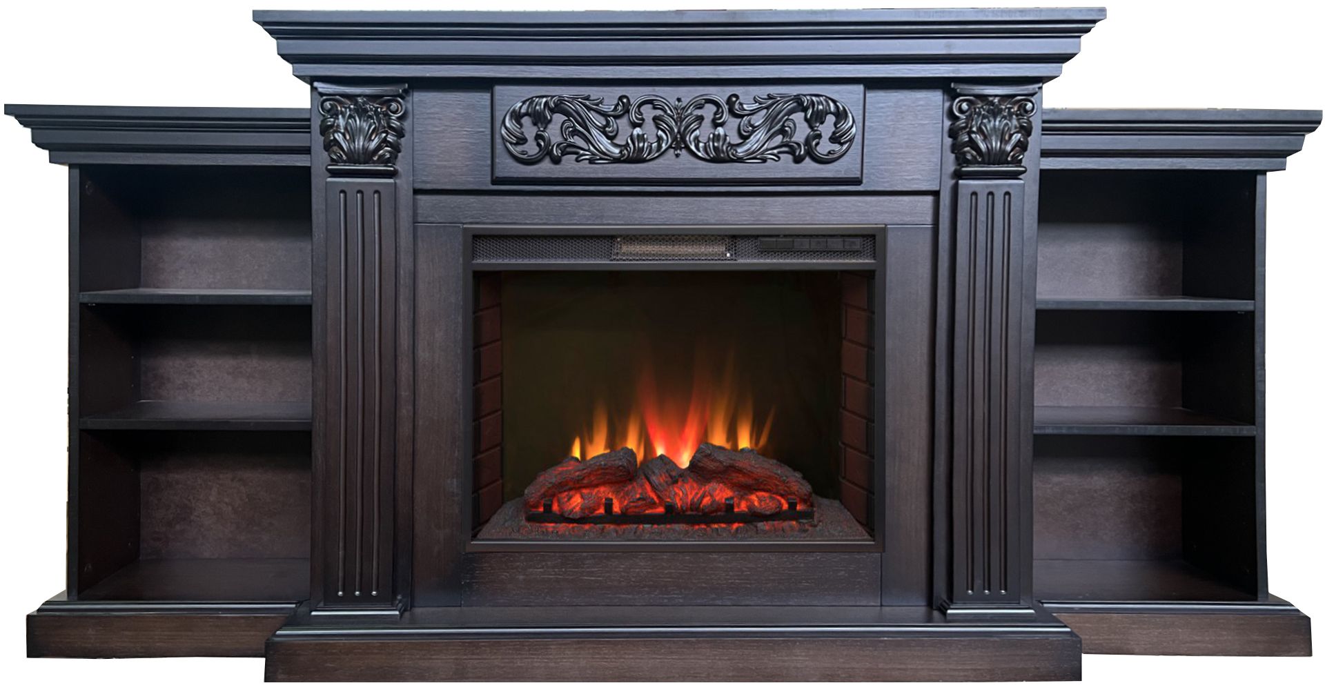 Электрокамин Авалон Premium AO с очагом Sparta 25.5 LED состоит из портала с 2 тумбами по бокам и широкого электроочага. Портал изготовлен из качественного МДФ и натурального шпона в цвете дуб темный. Преимуществом данного каминокомплекта являются боковые тумбы с тремя секциями полок по обе стороны от топки, которые обеспечат вам пространство для хранения всех ваших любимых книг, газет и домашних аксессуаров.