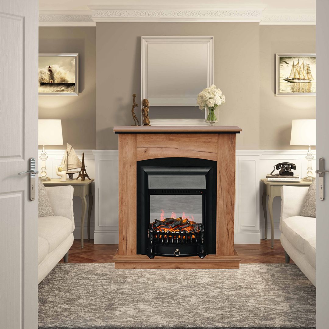 Портал укомплектован классическим электроочагом Fobos. В очаге визуальный эффект горящего огня создается с помощью проекционной LED-технологии. Присутствует звуковой эффект горения пламени и потрескивания дров. Очаг может работать как в режиме обогрева, так и в декоративном режиме без обогрева. В режиме обогрева в очаге предусмотрено 2 уровня регулировки обогрева, возможно переключение мощности обогрева 750-1500 Вт, поэтому в холодные дни данный электрокамин можно использовать как дополнительный источник тепла. Предусмотрена функция защиты от перегрева.