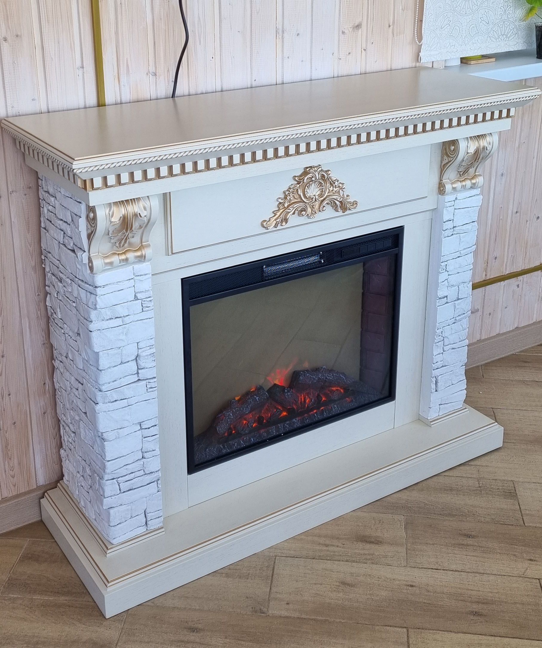 Электрокамин Бронкс WT с очагом Sparta 25.5 LED изготовлен из шпонированного МДФ и облицован искусственным камнем. Каминокомплект с такой облицовкой будет прекрасно смотреться как в городском интерьере, так и в загородном доме. Фронтальная часть портала украшена резьбой. Этот электрокамин станет точкой притяжения вашего интерьера.