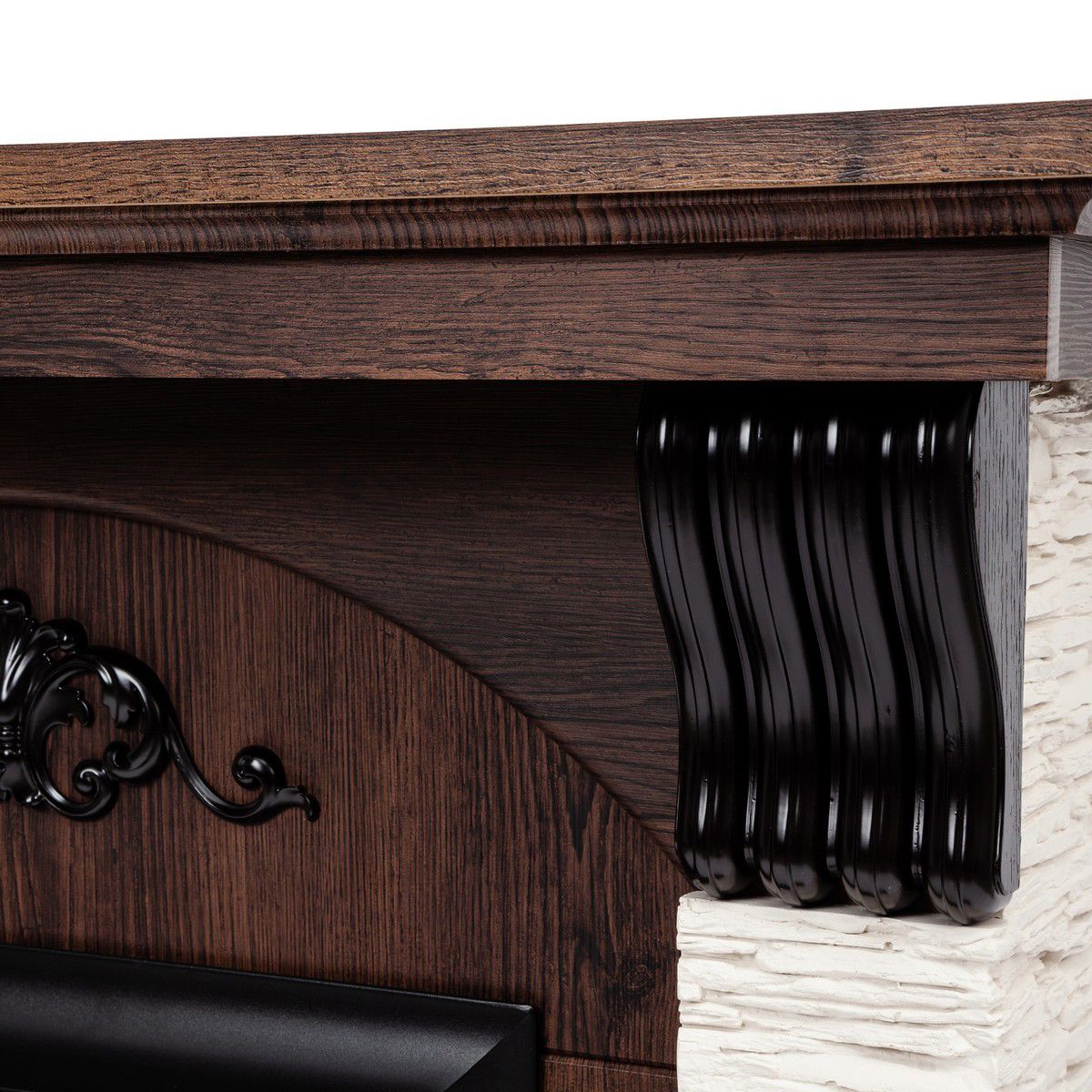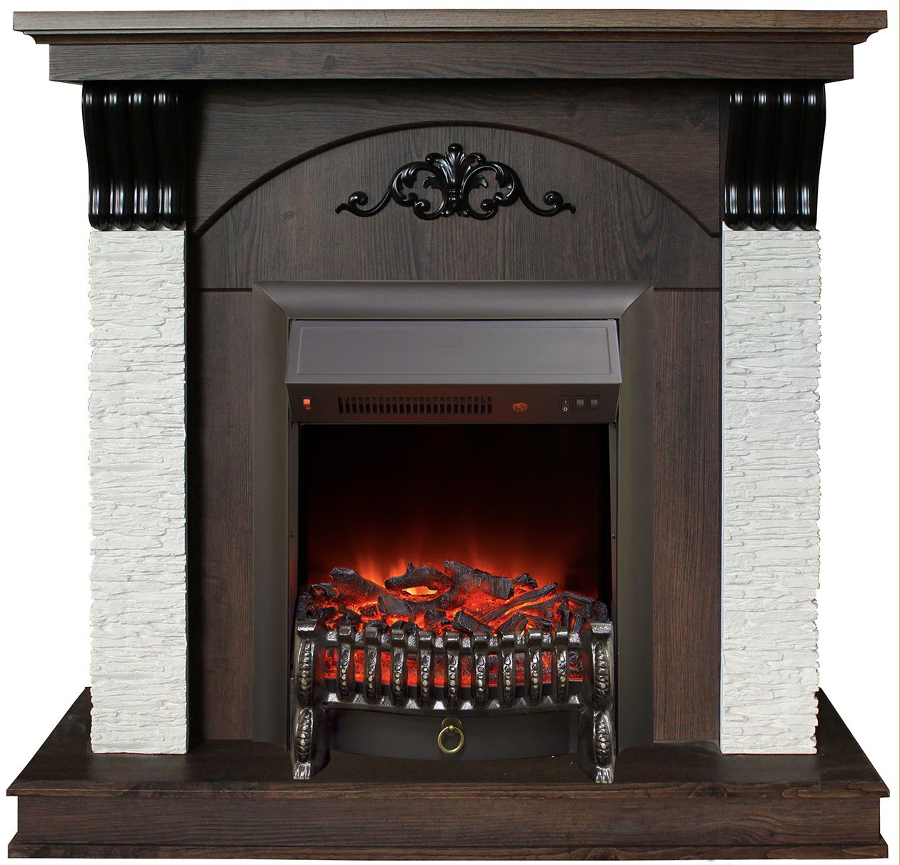 Портал укомплектован классическим электроочагом Fobos. В очаге визуальный эффект горящего огня создается с помощью проекционной LED-технологии. Присутствует звуковой эффект горения пламени и потрескивания дров. Очаг может работать как в режиме обогрева, так и в декоративном режиме без обогрева. В режиме обогрева в очаге предусмотрено 2 уровня регулировки обогрева, возможно переключение мощности обогрева 750-1500 Вт, поэтому в холодные дни данный электрокамин можно использовать как дополнительный источник тепла. Предусмотрена функция защиты от перегрева.