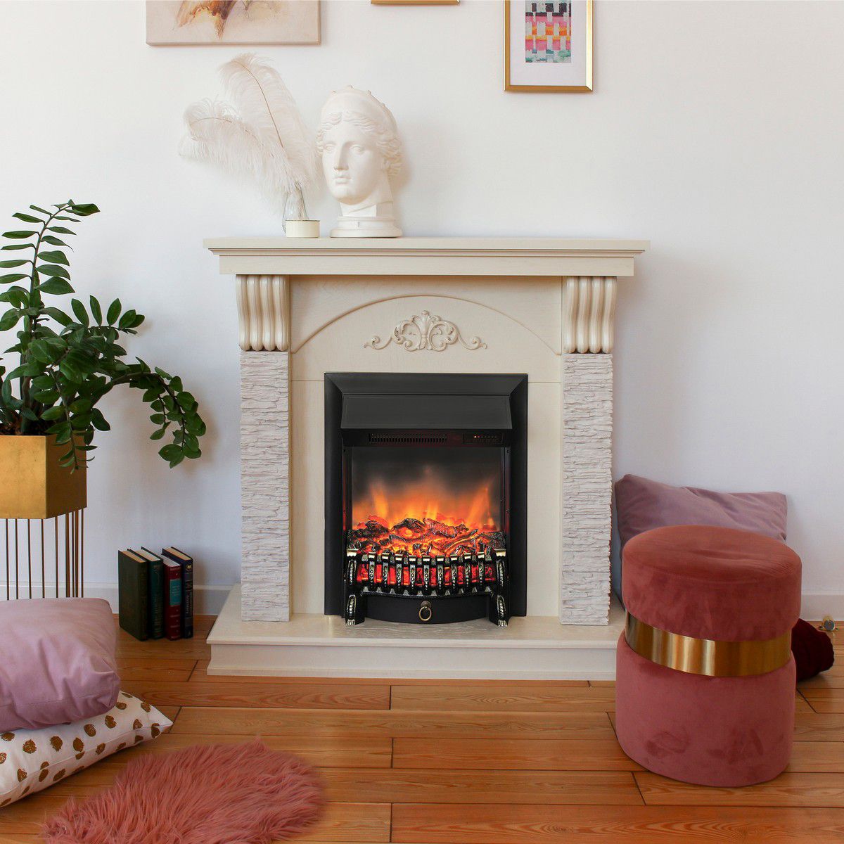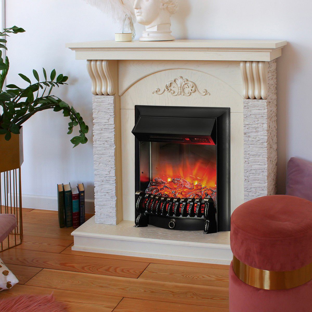 Портал укомплектован классическим электроочагом Fobos RC. В очаге визуальный эффект горящего огня создается с помощью проекционной LED-технологии. Присутствует звуковой эффект горения пламени и потрескивания дров. Очаг может работать как в режиме обогрева, так и в декоративном режиме без обогрева. В режиме обогрева в очаге предусмотрено 2 уровня регулировки обогрева, возможно переключение мощности обогрева 750-1500 Вт, поэтому в холодные дни данный электрокамин можно использовать как дополнительный источник тепла. Предусмотрена функция защиты от перегрева.