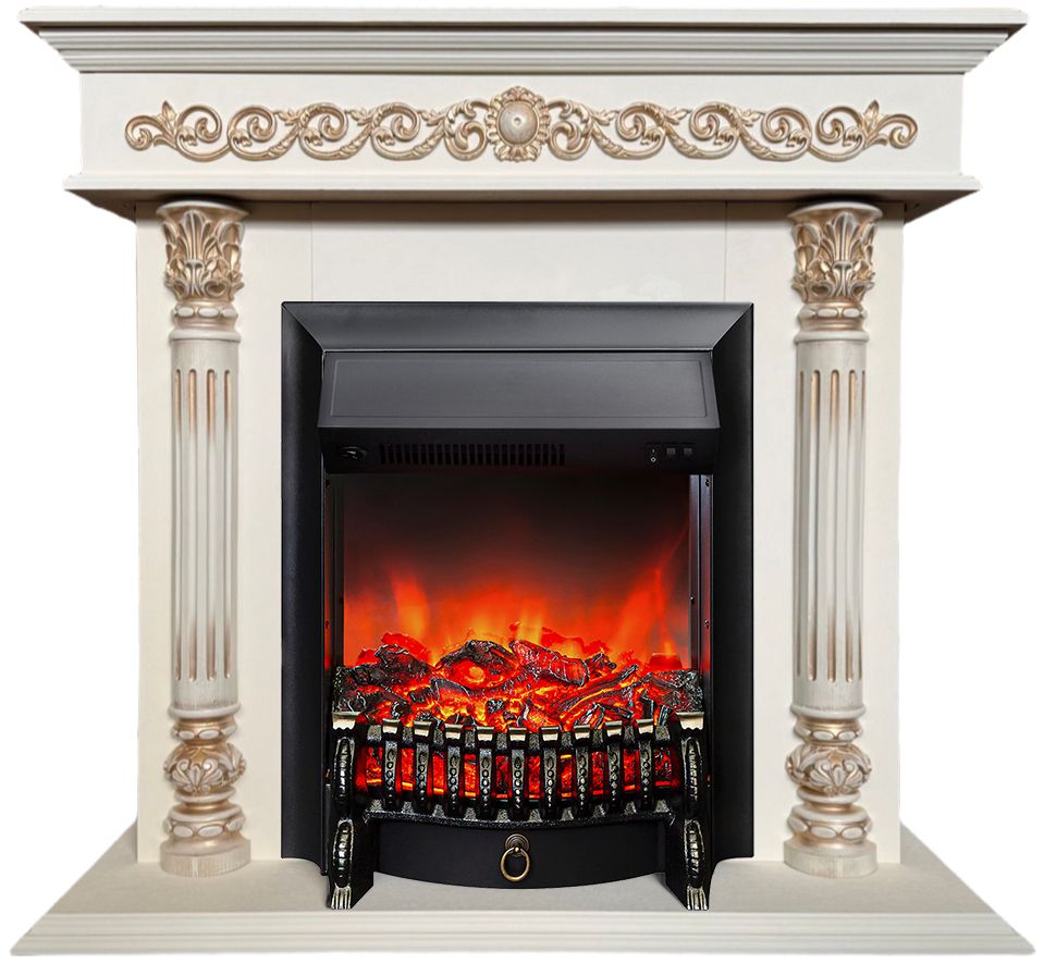 Электрокамин Диана SLG с очагом Fobos RC - простой и элегантный каминокомплект, изготовленный из высококачественного МДФ и покрыт экошпоном в благородном цвете слоновая кость с нанесением патины золото на элементы декора.