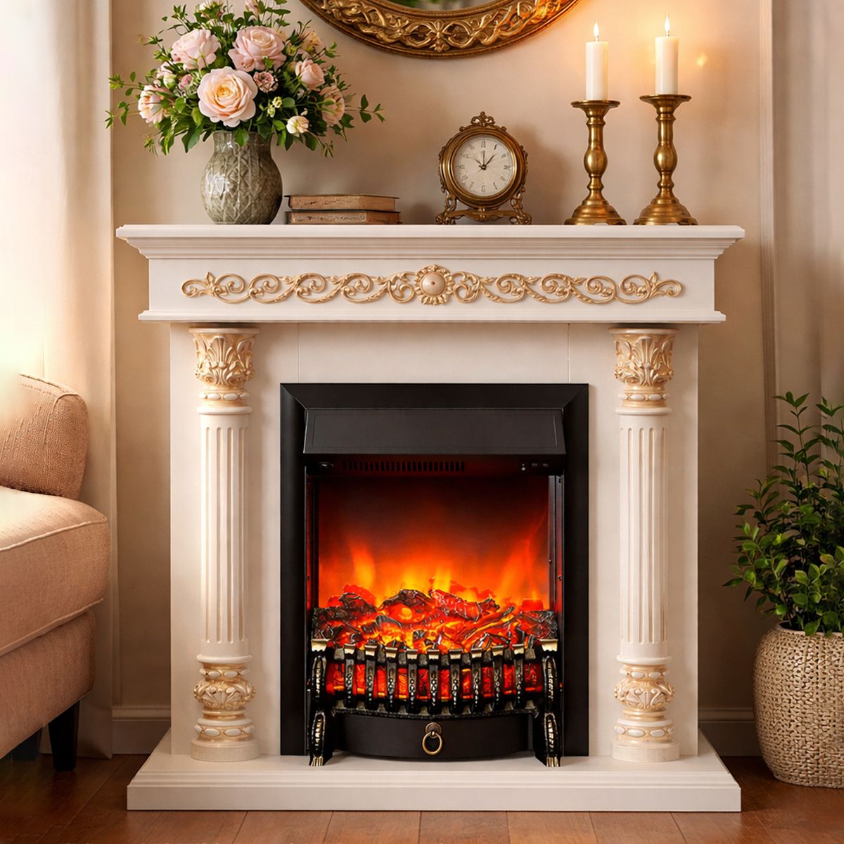 Особое внимание привлекает центральная часть портала над очагом — здесь расположен шикарный резной декоративный элемент с изящным орнаментом, который подчеркивает статусный и элегантный характер камина. Такой декор делает модель особенно выразительной и добавляет интерьеру нотки роскоши.