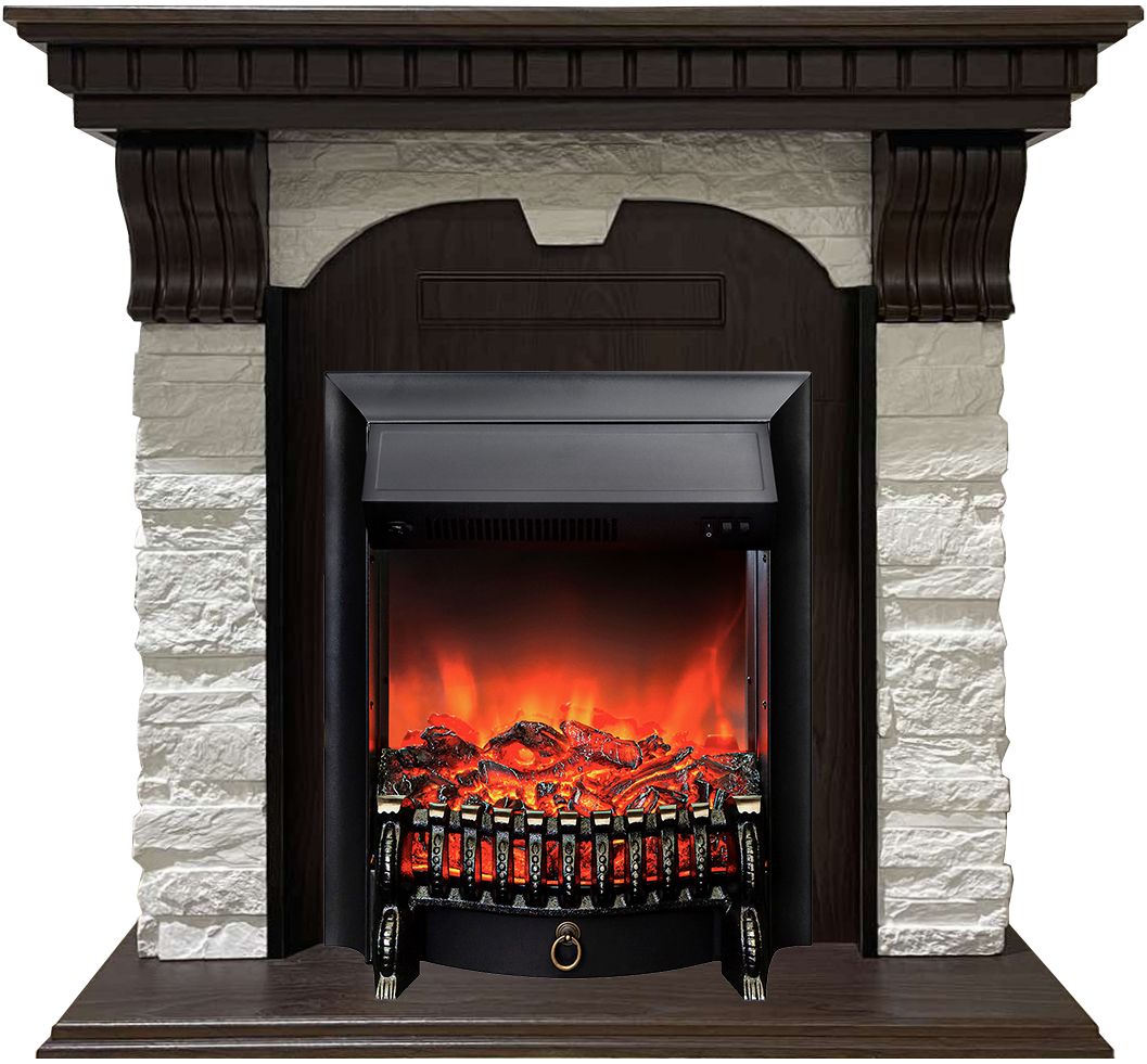 Электрокамин Дублин AO M2 с очагом Fobos изготовлен из МДФ в цвете дуб темный и облицован искусственным камнем белого цвета. На ваш выбор 6 цветов искусственного камня. Каминокомплект с такой облицовкой будет прекрасно смотреться как в городском интерьере, так и в загородном доме.