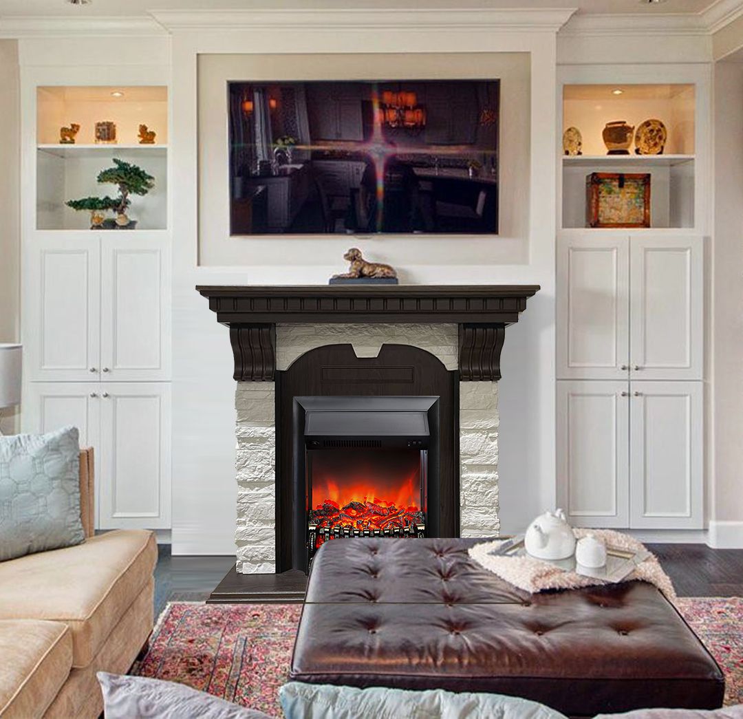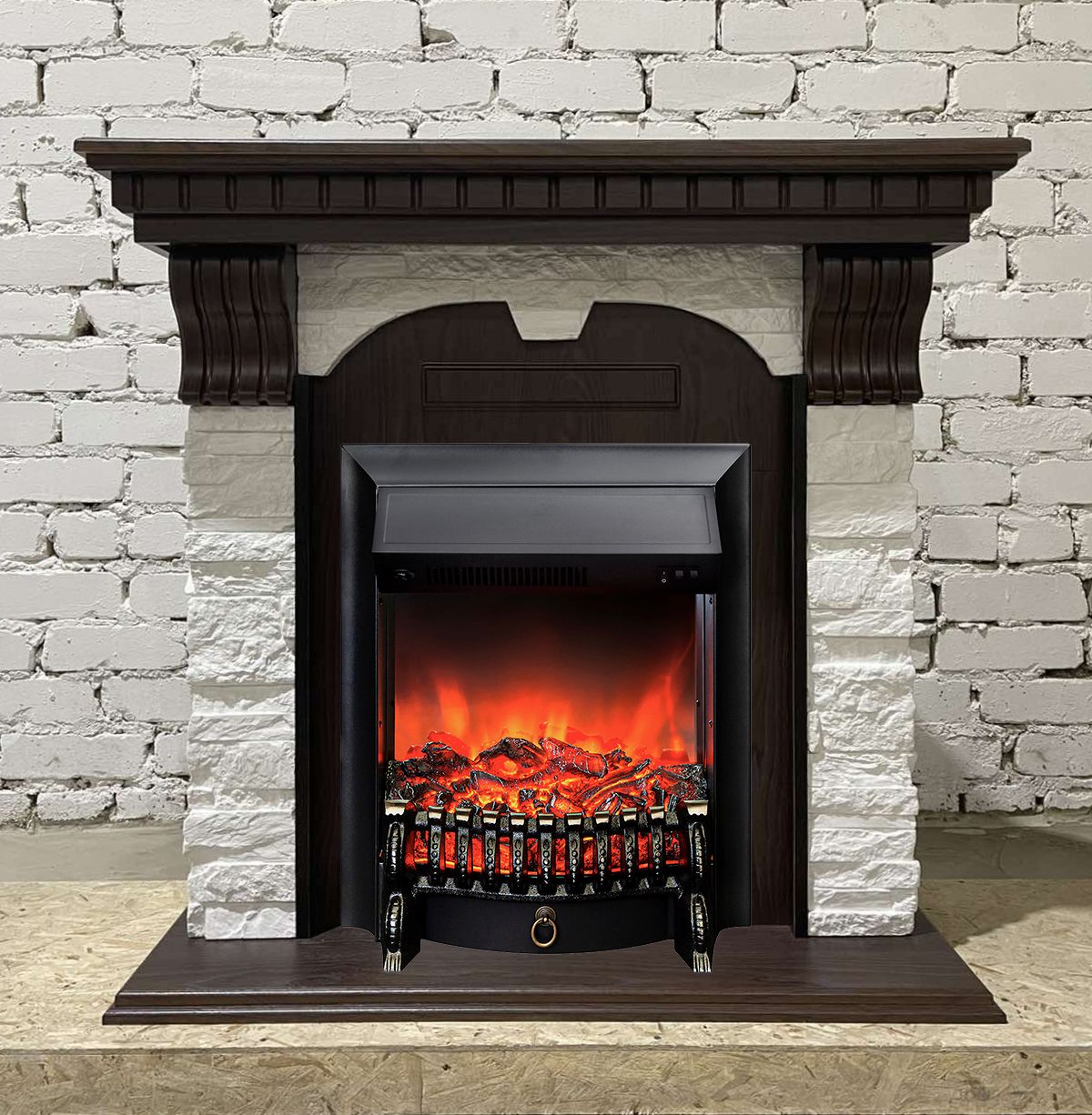 Портал укомплектован классическим электроочагом Fobos. В очаге визуальный эффект горящего огня создается с помощью проекционной LED-технологии. Присутствует звуковой эффект горения пламени и потрескивания дров. Очаг может работать как в режиме обогрева, так и в декоративном режиме без обогрева. В режиме обогрева в очаге предусмотрено 2 уровня регулировки обогрева, возможно переключение мощности обогрева 750-1500 Вт, поэтому в холодные дни данный электрокамин можно использовать как дополнительный источник тепла. Предусмотрена функция защиты от перегрева.