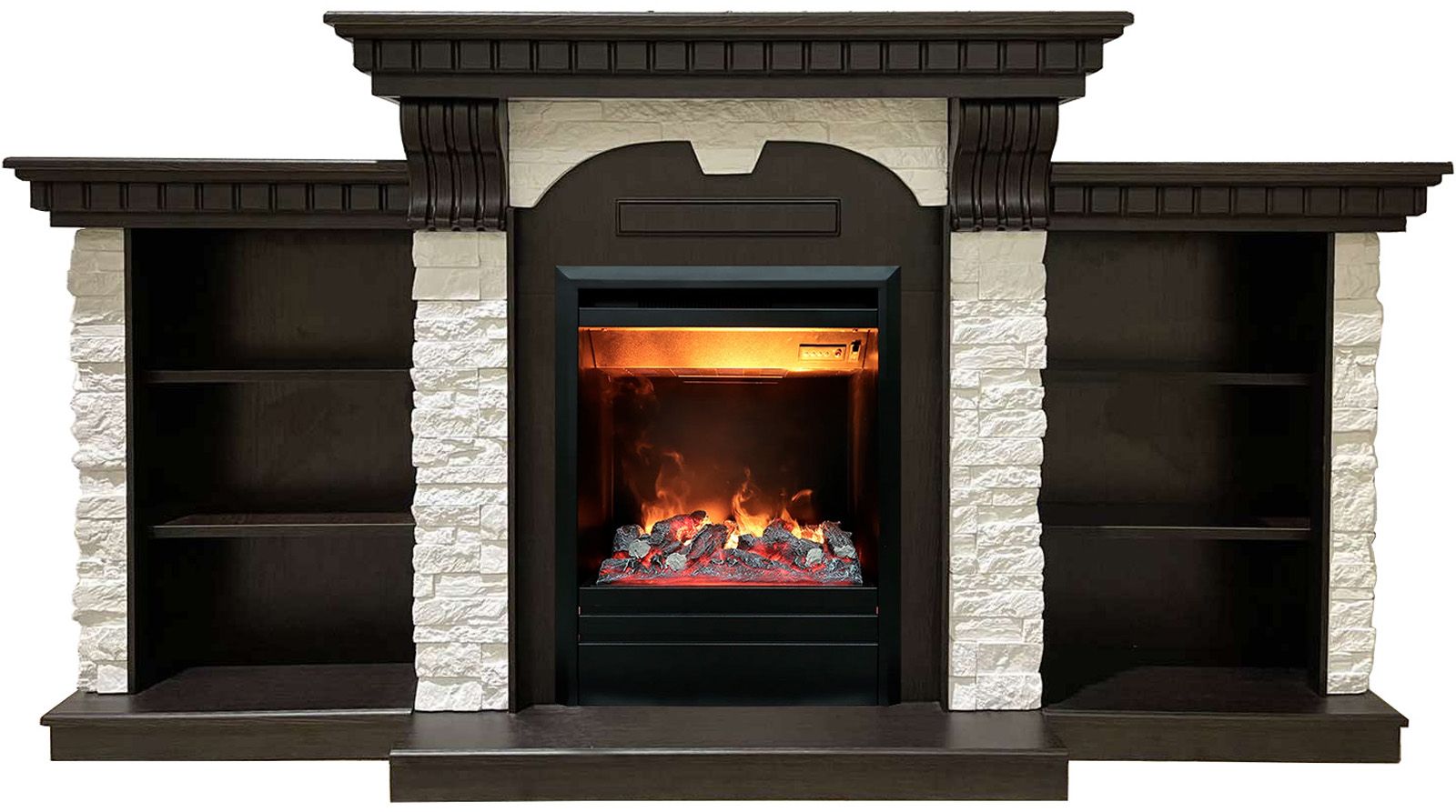 Портал электрокамина изготовлен из МДФ и облицован искусственным камнем. На ваш выбор 6 цветов искусственного камня. Портал дополняют тумбы с тремя секциями полок по обе стороны от топки, которые обеспечат вам пространство для хранения всех ваших любимых книг, газет и домашних аксессуаров.