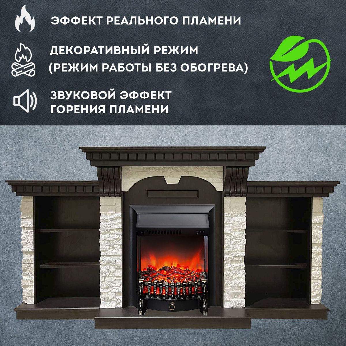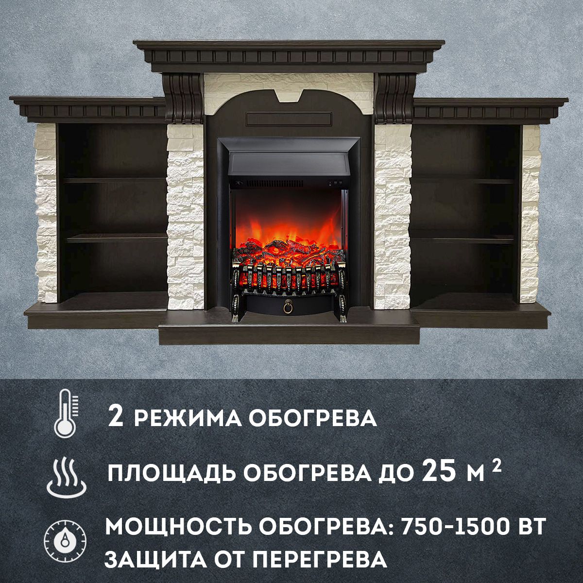 Электрический камин Дублин Премиум может работать как в режиме обогрева, так и в декоративном режиме без обогрева. В режиме обогрева в электрокамине предусмотрено 2 уровня регулировки обогрева, возможно переключение мощности обогрева 750-1500 Вт, поэтому в холодные дни данный электрокамин можно использовать как дополнительный источник тепла. Предусмотрена функция защиты от перегрева.