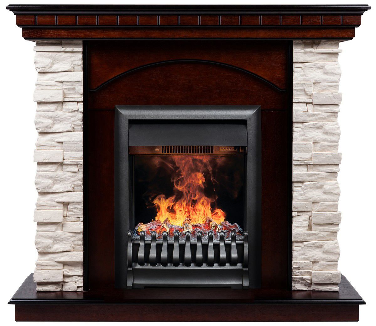 В комплекте используется классический узкий электроочаг 3D Oregan, который оснащен современным эффектом пламени 3D нового поколения. Абсолютно реалистичная имитация пламени, которая выглядит максимально достоверно за счёт эффекта дыма. Эффект пламени притягивает к себе внимание с первых секунд. В очаге реализован один из самых совершенных способов имитации пламени 3D на сегодняшний день. Электроочаг оборудован защитой включения без воды. Присутствует звуковой эффект горения пламени и потрескивания дров. Комплектуется пультом дистанционного управления, с помощью которого регулируется высота и яркость пламени.