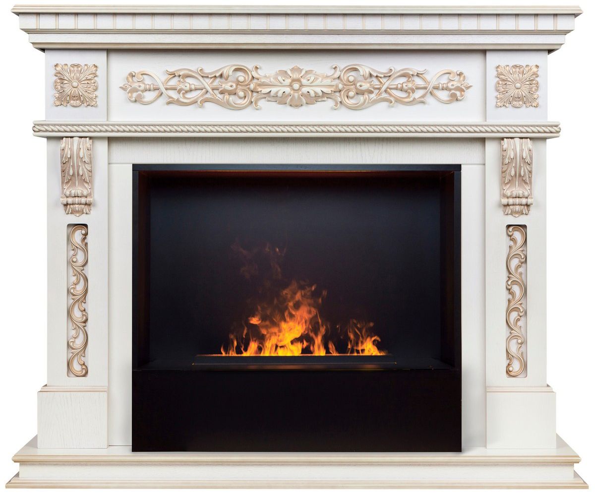 Электрокамин Estella WT с очагом 3D Cassette 630 Black Panel изготовлен из МДФ и натурального шпона в цвете белый дуб с золотой патиной. Эта модель прекрасно вписывается в современный интерьер квартиры или загородного дома.