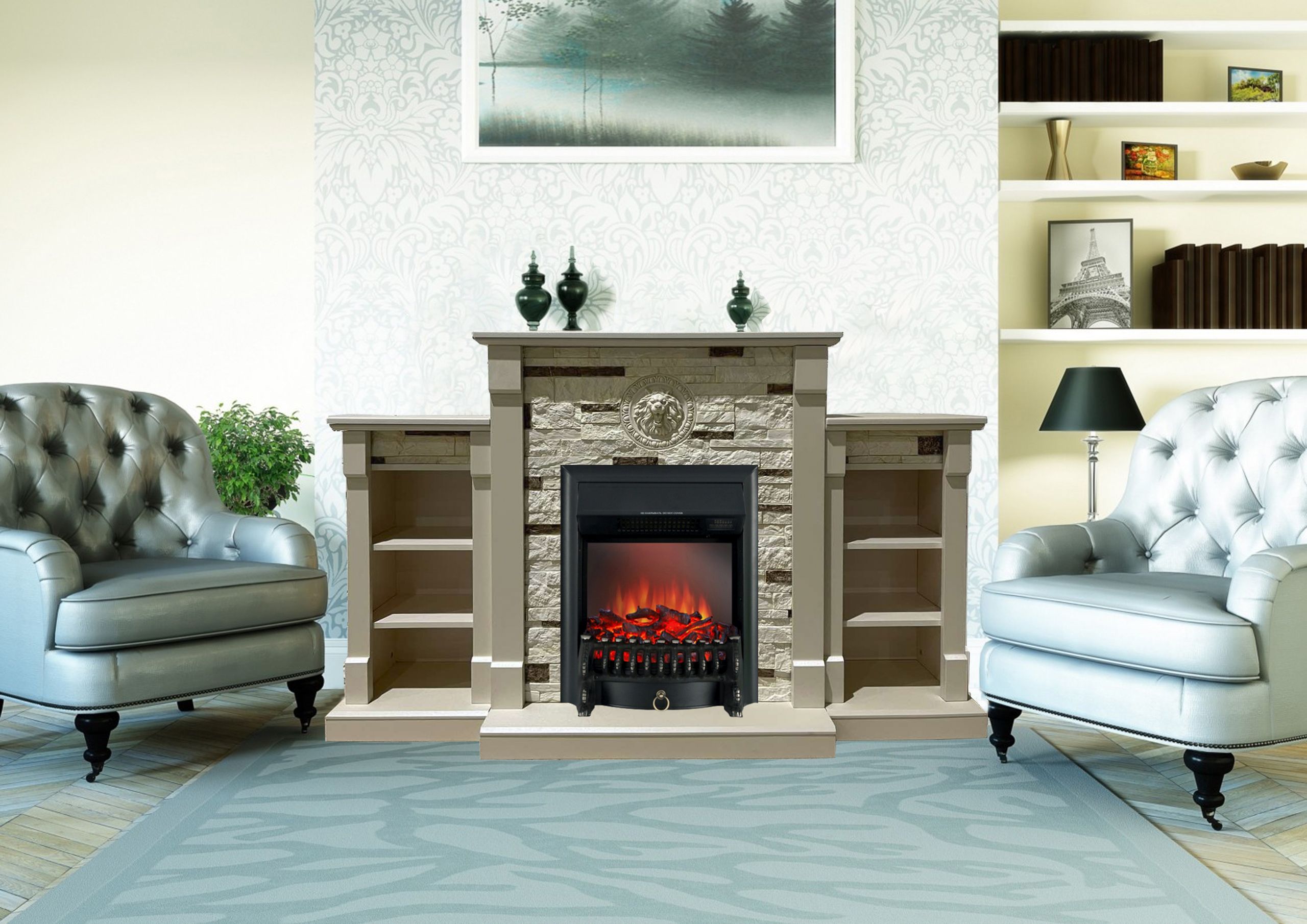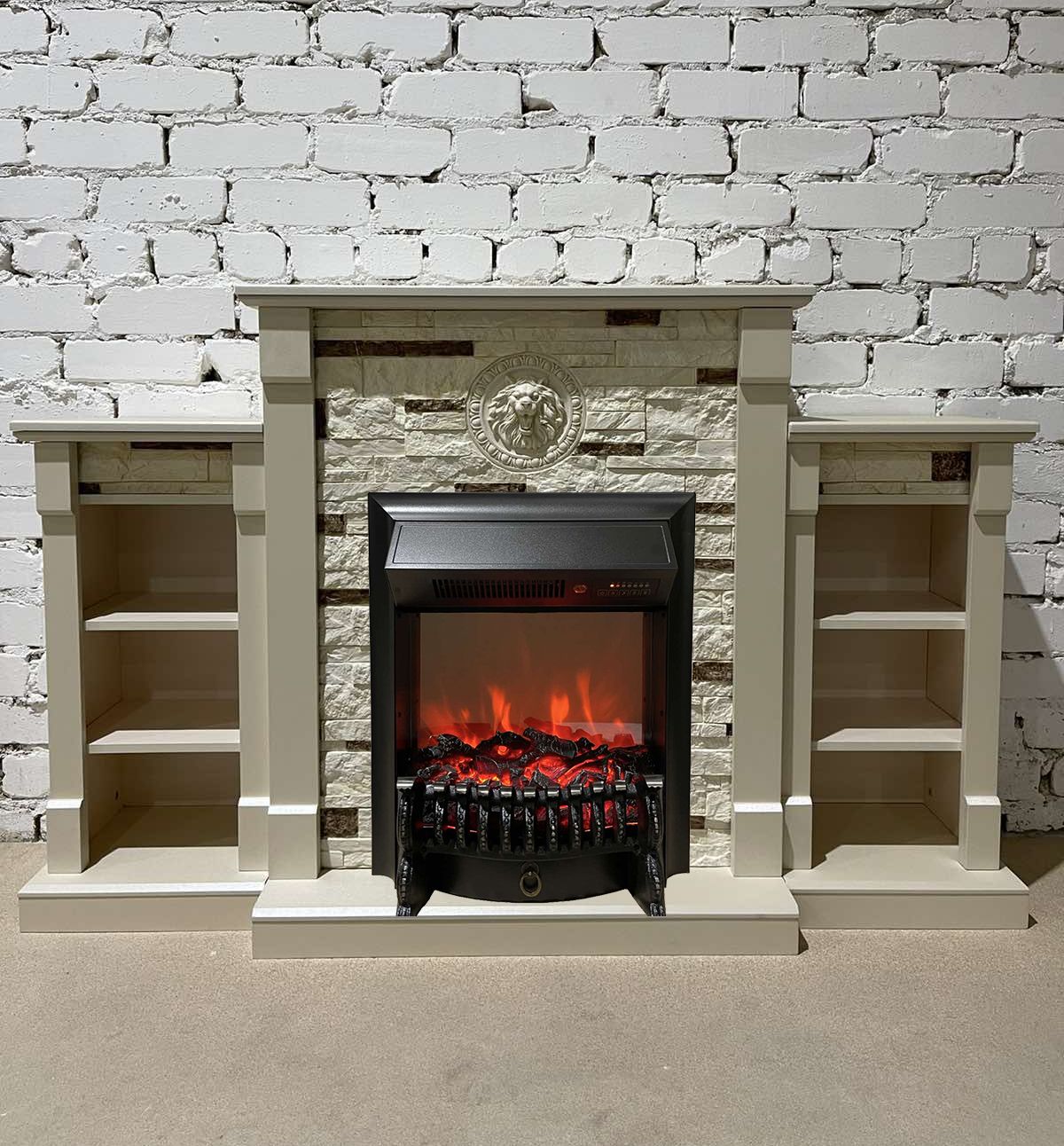 Портал укомплектован классическим электроочагом Fobos. В очаге визуальный эффект горящего огня создается с помощью проекционной LED-технологии. Присутствует звуковой эффект горения пламени и потрескивания дров. Очаг может работать как в режиме обогрева, так и в декоративном режиме без обогрева. В режиме обогрева в очаге предусмотрено 2 уровня регулировки обогрева, возможно переключение мощности обогрева 750-1500 Вт, поэтому в холодные дни данный электрокамин можно использовать как дополнительный источник тепла. Предусмотрена функция защиты от перегрева.