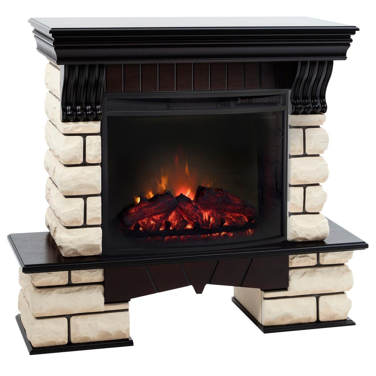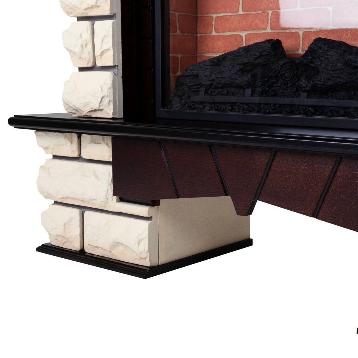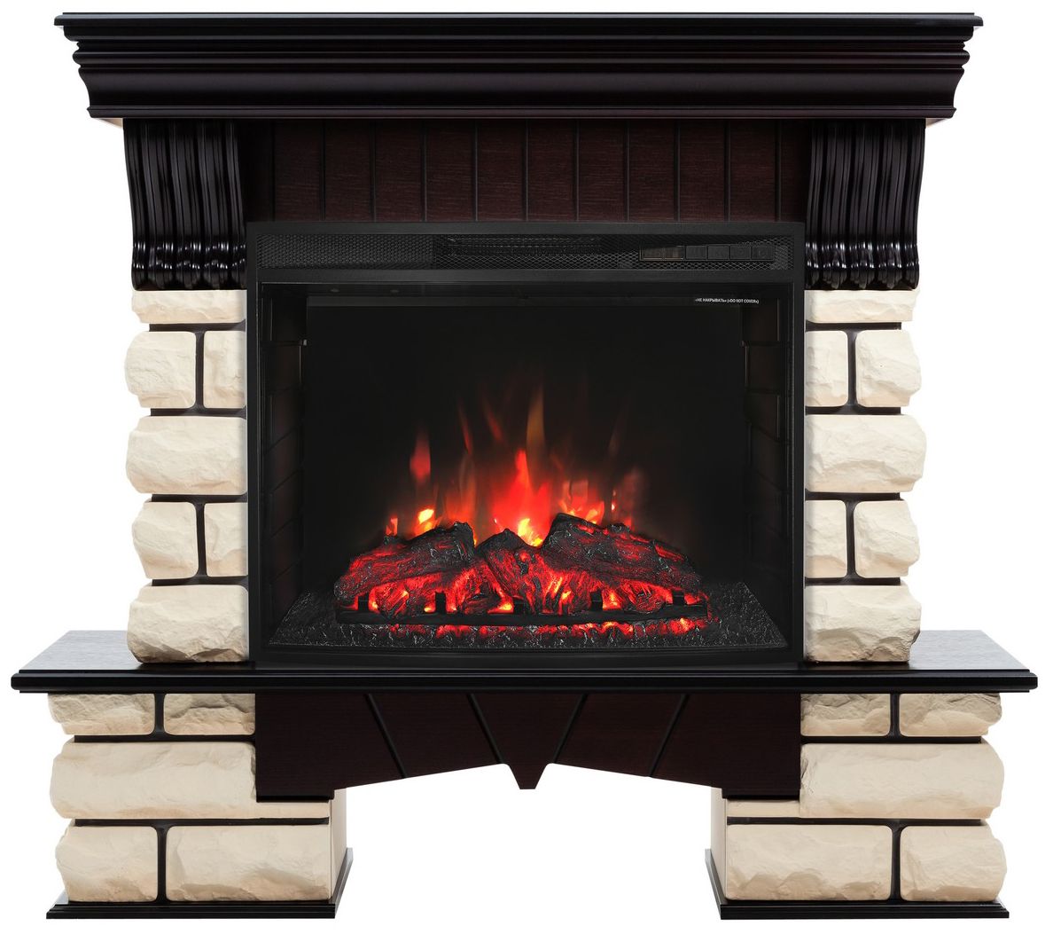 Портал укомплектован широким электроочагом Evrika 25.5 LED с великолепным разноцветным пламенем (3 цвета пламени), пламя в очаге смотрится выразительно и эффектно, а муляж дров и кирпичная кладка создают полное сходство с натуральным очагом. Эффект пламени притягивает к себе внимание с первых секунд. В очаге реализован один из самых совершенных способов визуализации пламени 2D на сегодняшний день. Визуальный эффект горящего огня создается с помощью проекционной LED-технологии.