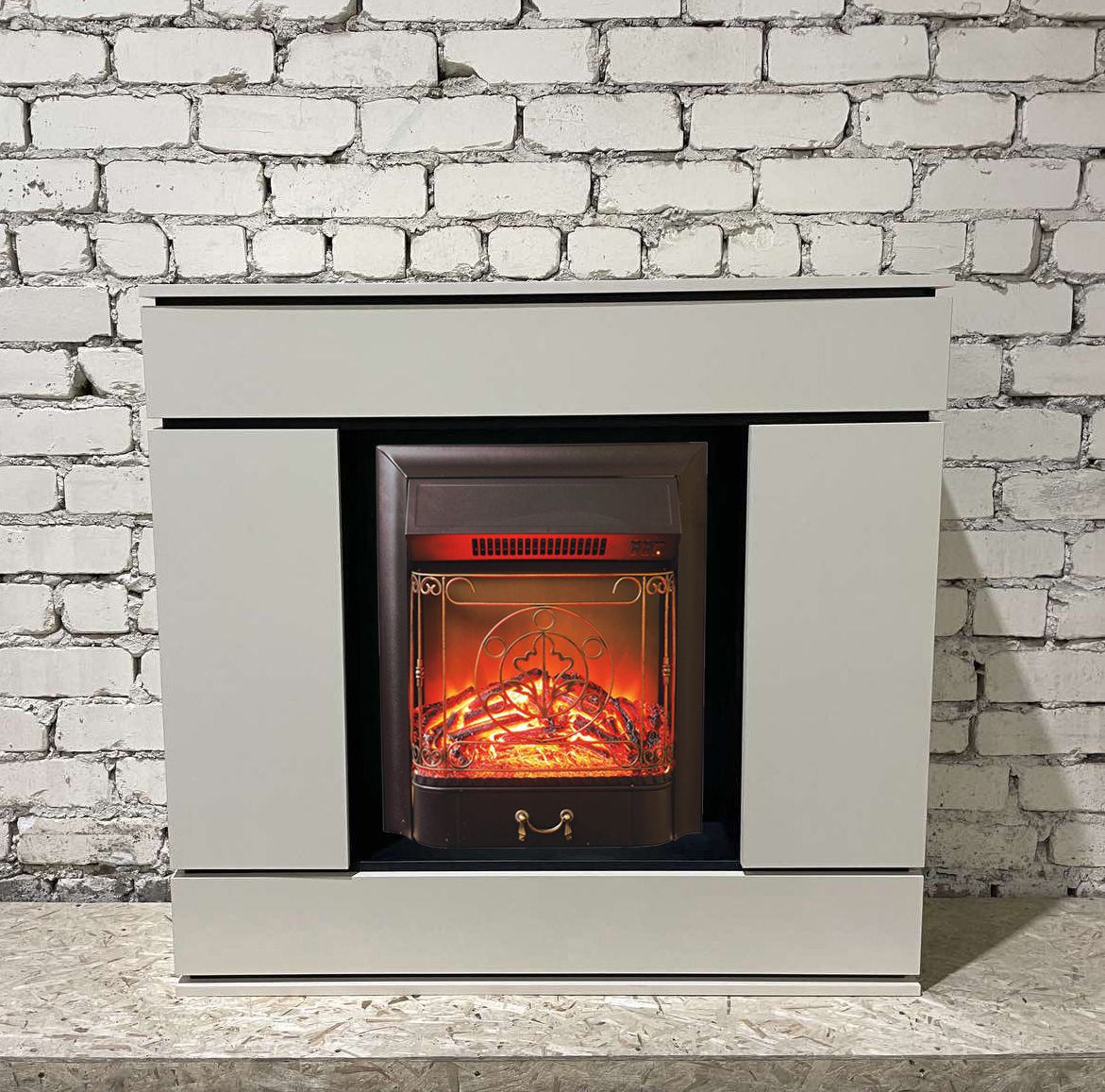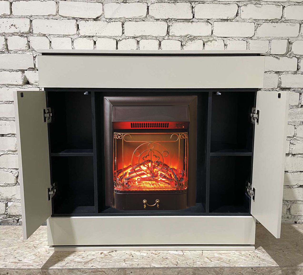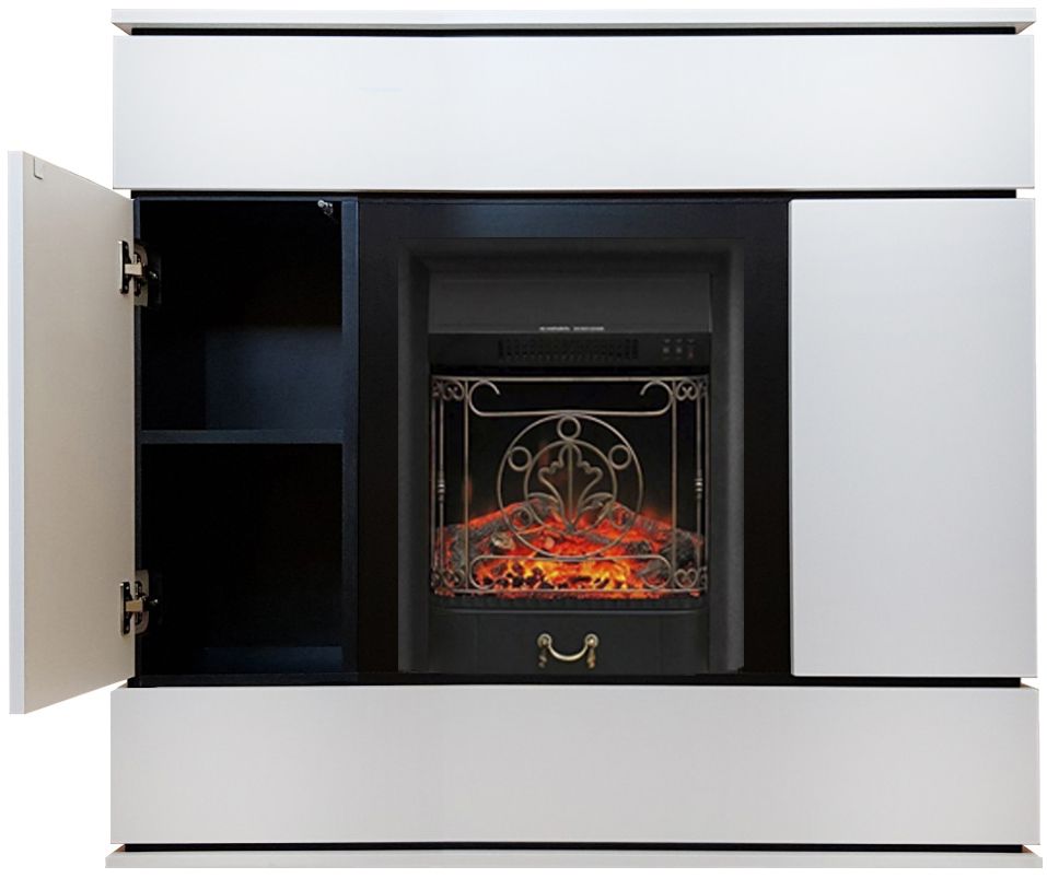 Портал укомплектован классическим электроочагом Majestic, возможно заменить на другой электрический очагом Fobos. В очаге визуальный эффект горящего огня создается с помощью проекционной LED-технологии. Присутствует звуковой эффект горения пламени и потрескивания дров. Очаг может работать как в режиме обогрева, так и в декоративном режиме без обогрева. В режиме обогрева в очаге предусмотрено 2 уровня регулировки обогрева, возможно переключение мощности обогрева 750-1500 Вт, поэтому в холодные дни данный электрокамин можно использовать как дополнительный источник тепла. Предусмотрена функция защиты от перегрева.