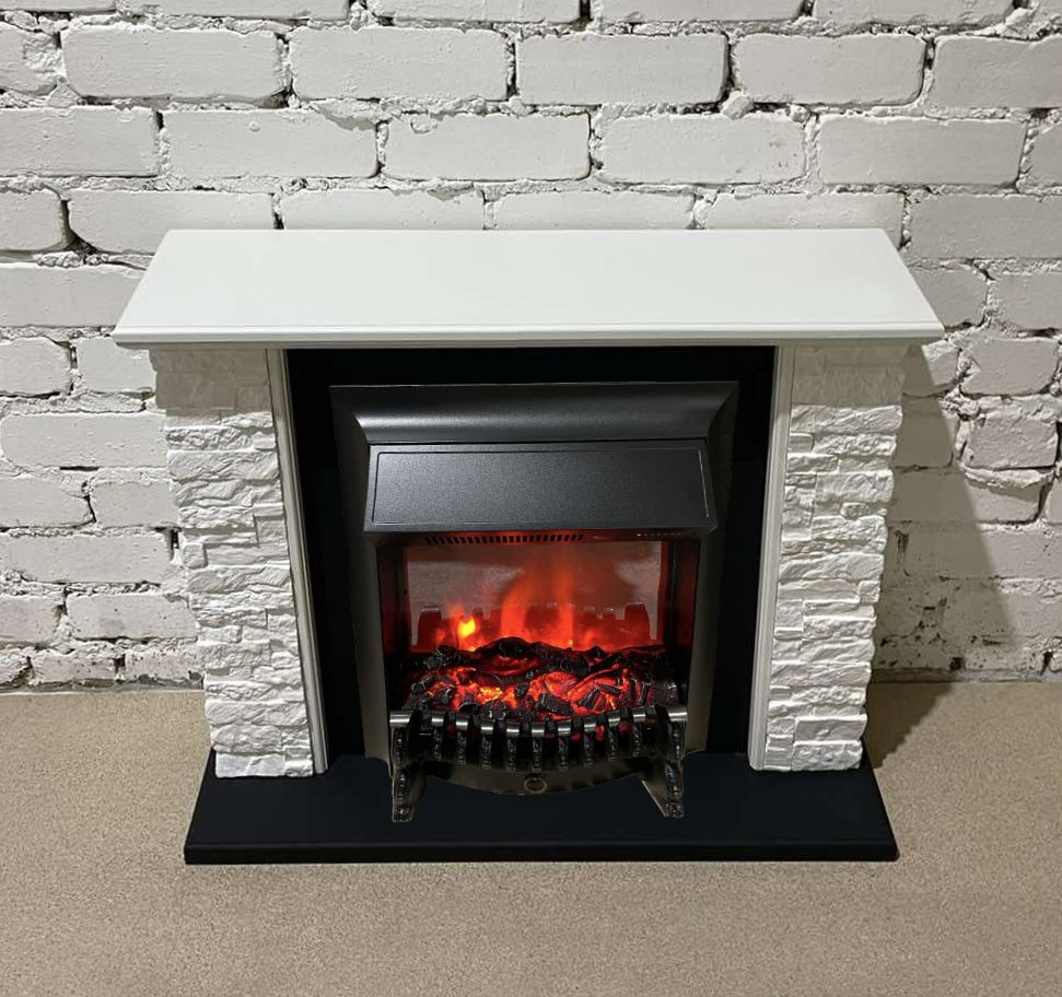 Электрокамин Кимберли WT-DK M2 с очагом Fobos изготовлен из МДФ и облицован искусственным камнем. МДФ в цвете белый с чёрным. Искусственный камень белого цвета. Столешница и боковины камина изготовлены в белом цвете, а подиум в чёрном цвете. На ваш выбор 6 цветов искусственного камня. Каминокомплект с такой облицовкой будет прекрасно смотреться как в городском интерьере, так и в загородном доме. Портал из камня с видом под старину подчеркнёт аристократический стиль дома.