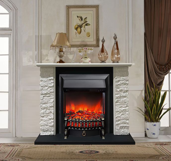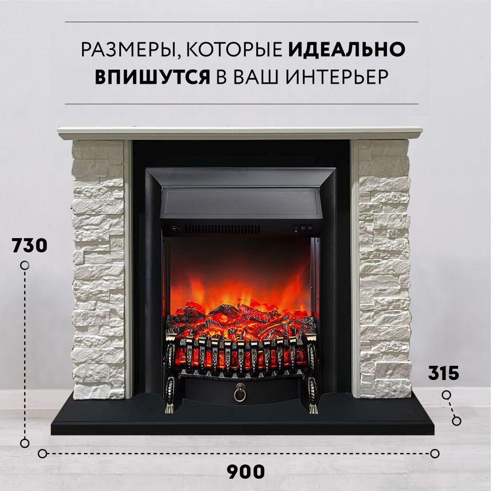 Портал укомплектован классическим электроочагом Fobos. В очаге визуальный эффект горящего огня создается с помощью проекционной LED-технологии. Присутствует звуковой эффект горения пламени и потрескивания дров. Очаг может работать как в режиме обогрева, так и в декоративном режиме без обогрева. В режиме обогрева в очаге предусмотрено 2 уровня регулировки обогрева, возможно переключение мощности обогрева 750-1500 Вт, поэтому в холодные дни данный электрокамин можно использовать как дополнительный источник тепла. Предусмотрена функция защиты от перегрева.