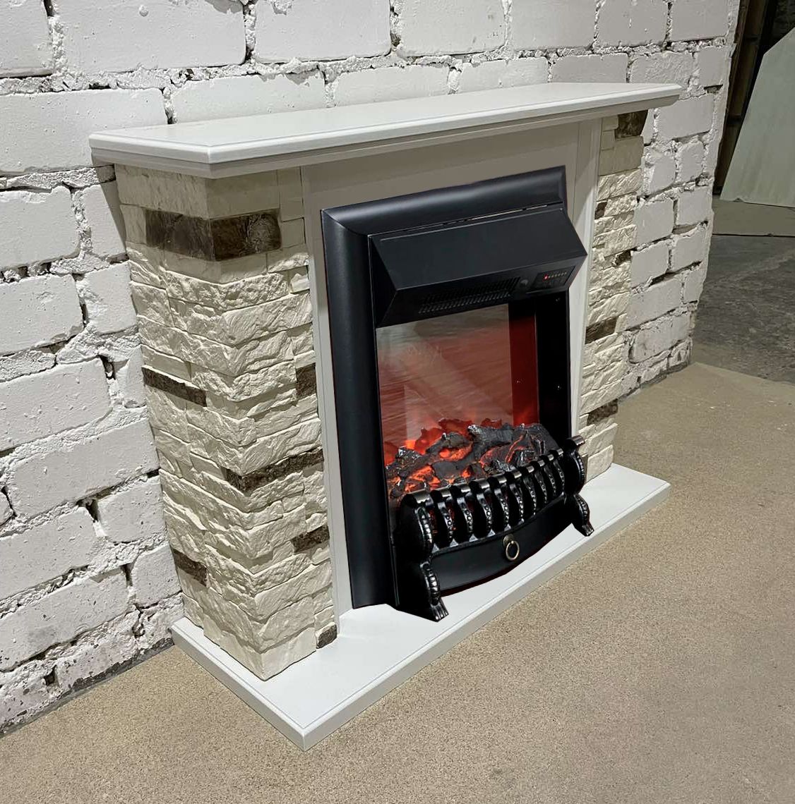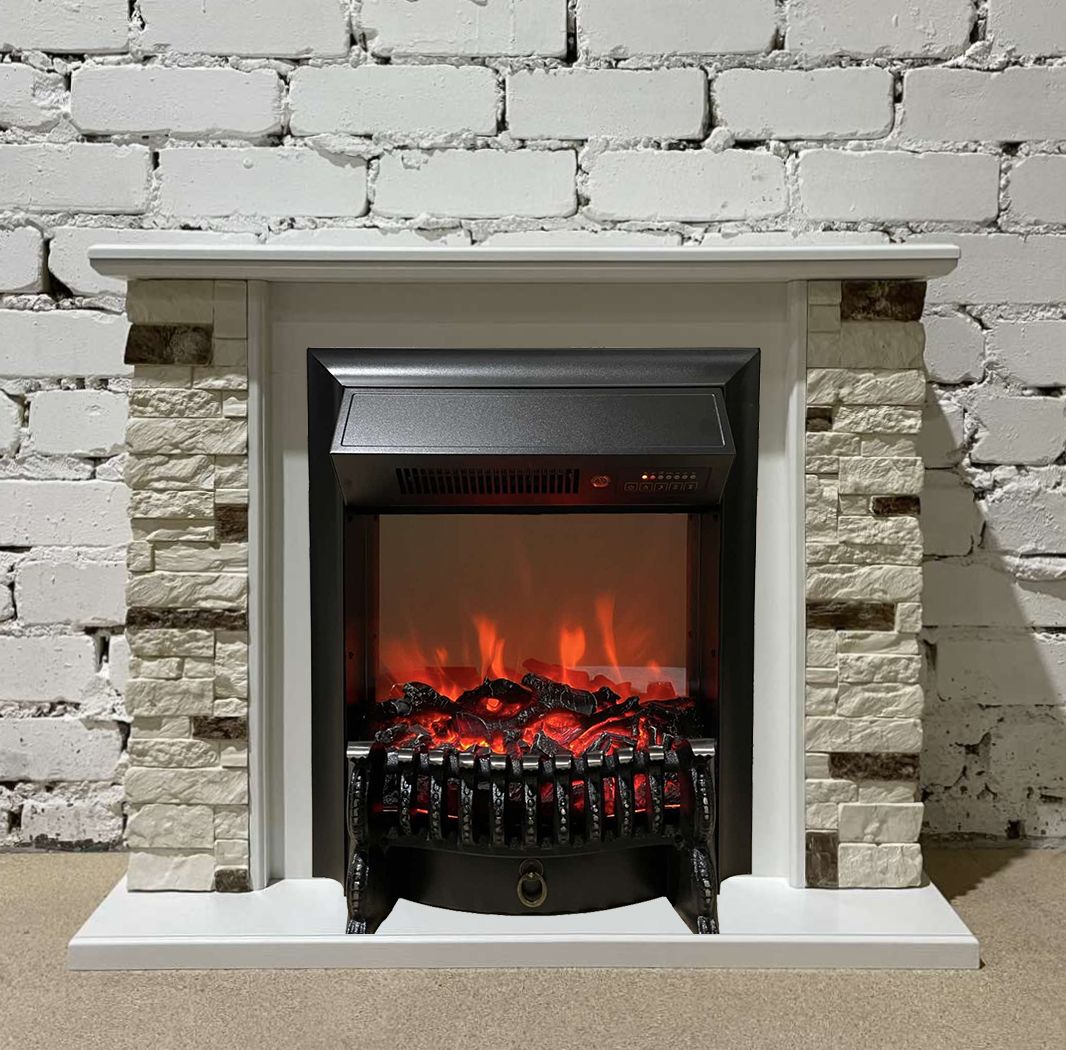 Портал укомплектован классическим электроочагом Fobos. В очаге визуальный эффект горящего огня создается с помощью проекционной LED-технологии. Присутствует звуковой эффект горения пламени и потрескивания дров. Очаг может работать как в режиме обогрева, так и в декоративном режиме без обогрева. В режиме обогрева в очаге предусмотрено 2 уровня регулировки обогрева, возможно переключение мощности обогрева 750-1500 Вт, поэтому в холодные дни данный электрокамин можно использовать как дополнительный источник тепла. Предусмотрена функция защиты от перегрева.