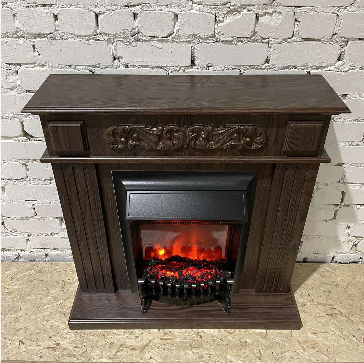 Портал укомплектован классическим электроочагом Fobos. В очаге визуальный эффект горящего огня создается с помощью проекционной LED-технологии. Присутствует звуковой эффект горения пламени и потрескивания дров. Очаг может работать как в режиме обогрева, так и в декоративном режиме без обогрева. В режиме обогрева в очаге предусмотрено 2 уровня регулировки обогрева, возможно переключение мощности обогрева 750-1500 Вт, поэтому в холодные дни данный электрокамин можно использовать как дополнительный источник тепла. Предусмотрена функция защиты от перегрева.