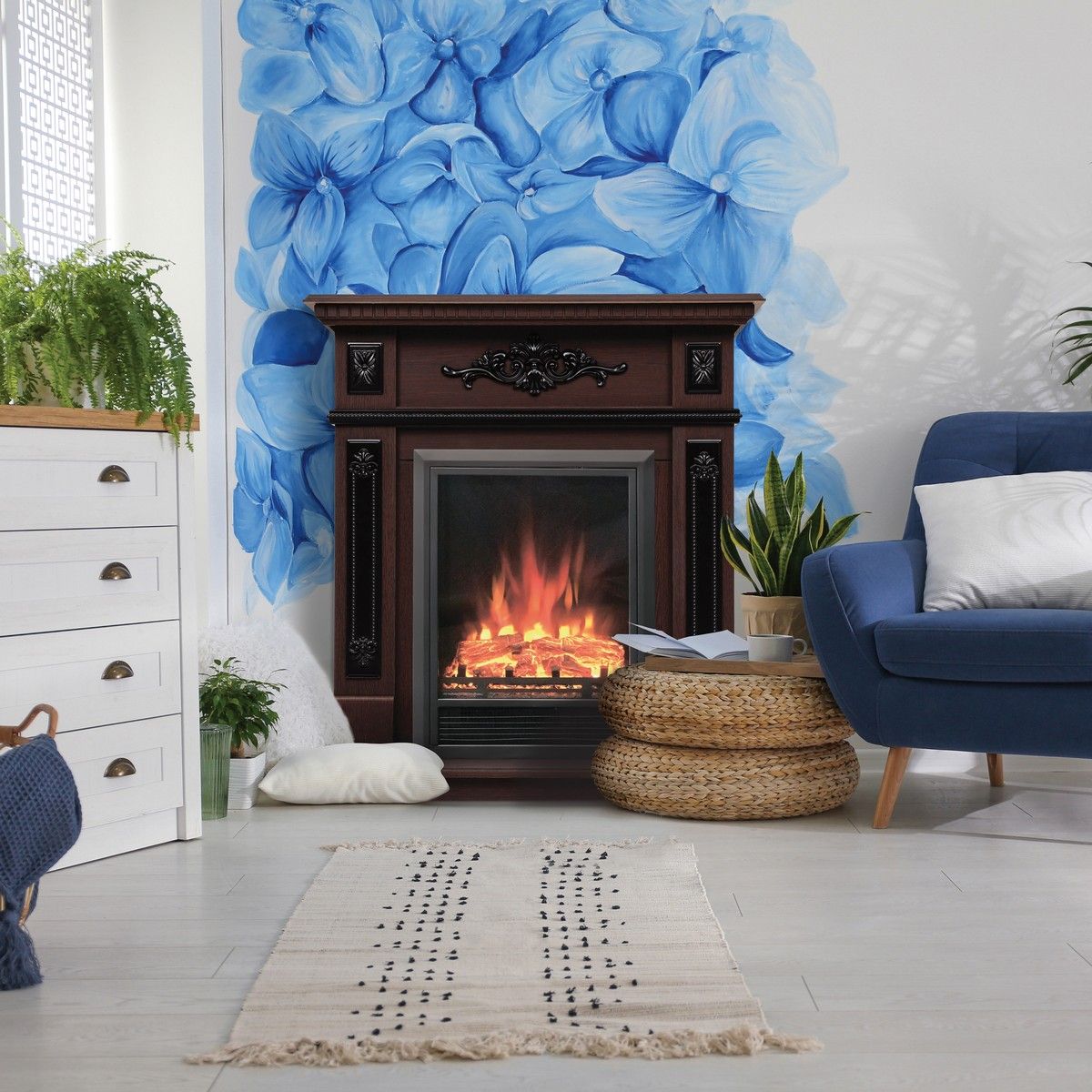 Укомплектован электроочагом Eugene - идеальное сочетание надежности, функциональности и внешнего вида. Данная модель электрического камина имеет черный цвет, строгая черная металлическая рамочка по периметру создает дополнительный дизайн. Основание электрокамина выполнено из металла. Цвет - строго черный, в составе идет муляж прогоревших дров на фоне темноматовой стенки. Для создания ощущения реалистичности пламени используется современная 2D-технология, очаг может использоваться как в режиме обогрева в холодное время года, так и в декоративном режиме, когда функция обогрева отключена. Очаг подойдет для любой из ваших комнат.
