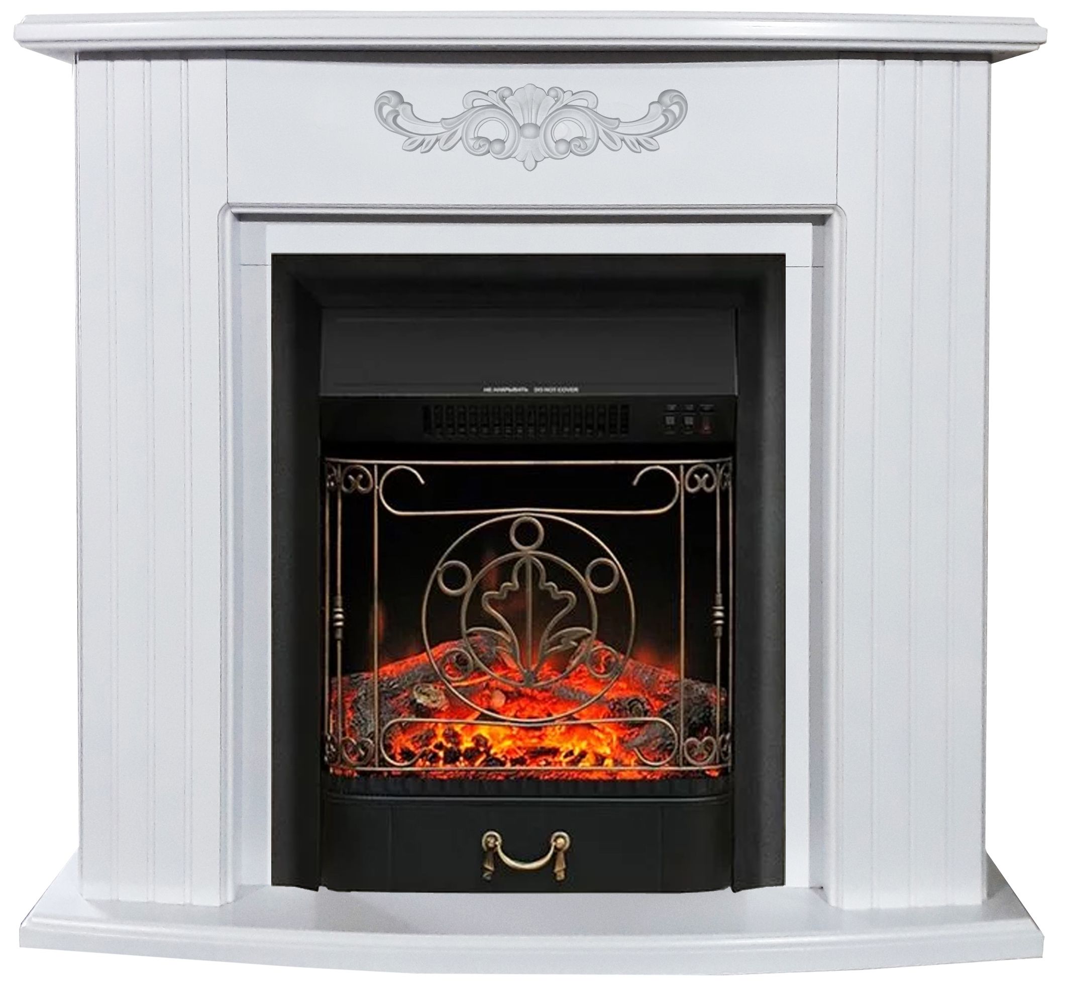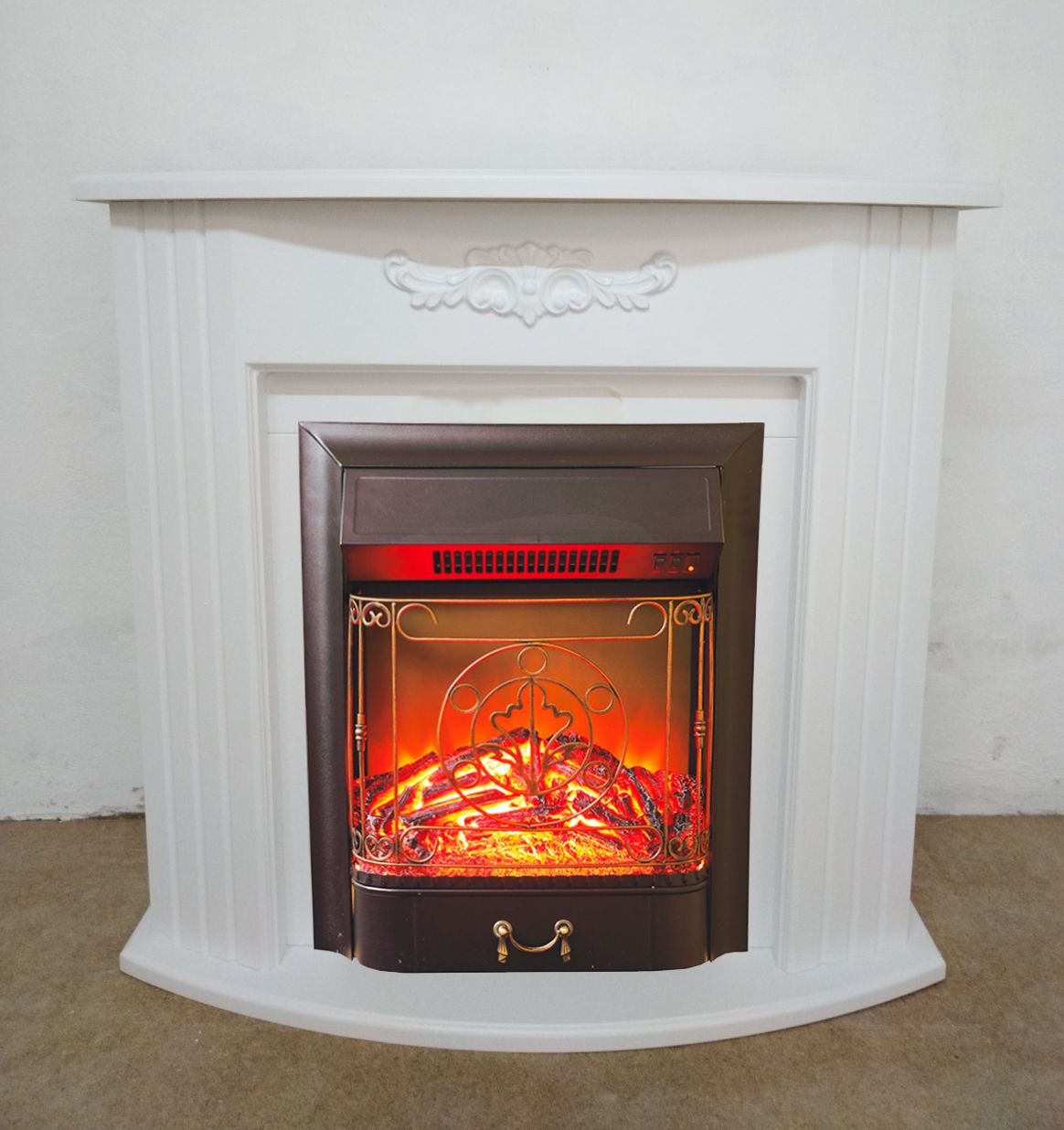 Портал укомплектован классическим электроочагом Majestic, который возможно заменить на другой электрический очаг Fobos. В очаге визуальный эффект горящего огня создается с помощью проекционной LED-технологии. Присутствует звуковой эффект горения пламени и потрескивания дров. Очаг может работать как в режиме обогрева, так и в декоративном режиме без обогрева. В режиме обогрева в очаге предусмотрено 2 уровня регулировки обогрева, возможно переключение мощности обогрева 750-1500 Вт, поэтому в холодные дни данный электрокамин можно использовать как дополнительный источник тепла. Предусмотрена функция защиты от перегрева.