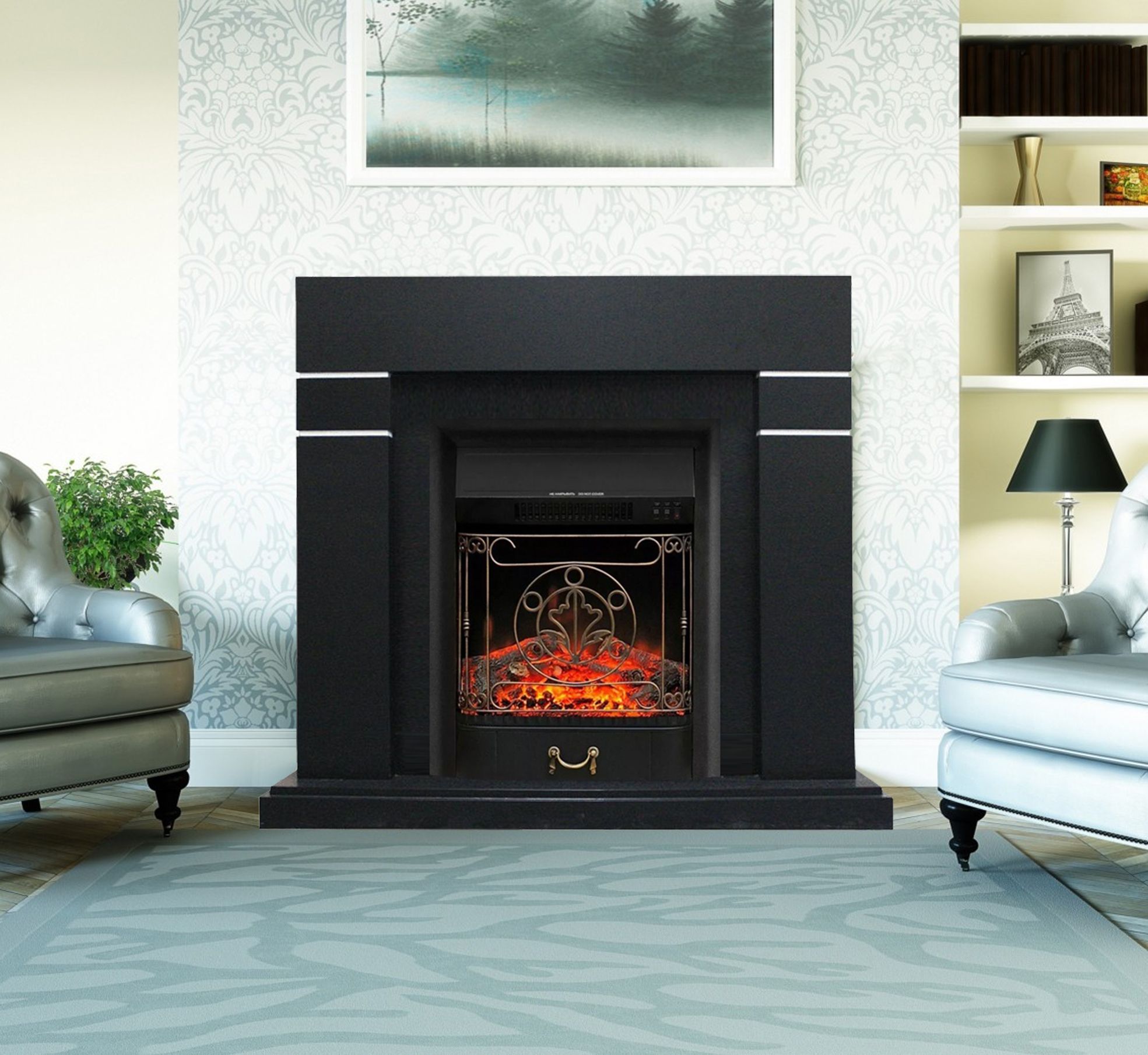 Портал укомплектован классическим электроочагом Majestic, который возможно заменить на другой электрический очаг Fobos. В очаге визуальный эффект горящего огня создается с помощью проекционной LED-технологии. Присутствует звуковой эффект горения пламени и потрескивания дров. Очаг может работать как в режиме обогрева, так и в декоративном режиме без обогрева. В режиме обогрева в очаге предусмотрено 2 уровня регулировки обогрева, возможно переключение мощности обогрева 750-1500 Вт, поэтому в холодные дни данный электрокамин можно использовать как дополнительный источник тепла. Предусмотрена функция защиты от перегрева.