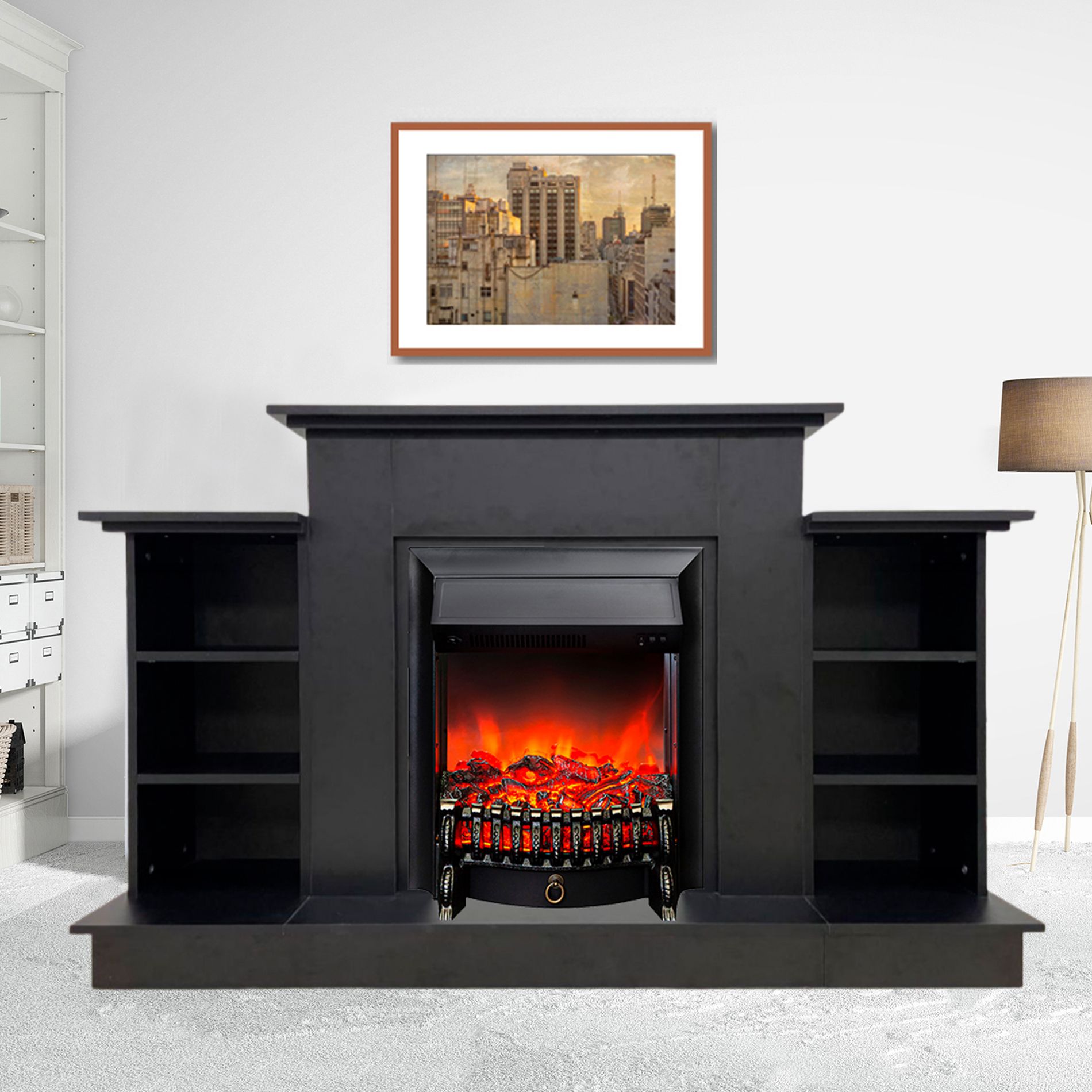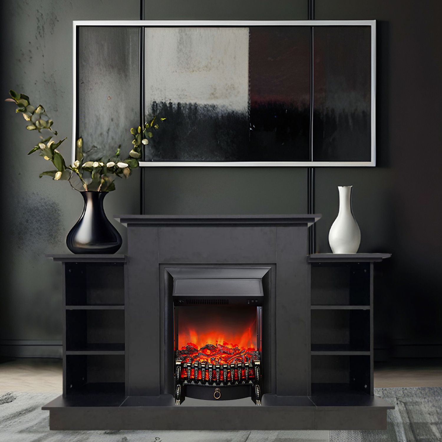 Портал дополняют тумбы с тремя секциями полок по обе стороны от топки. Выполнен в современном минималистском стиле, поэтому он идеально подойдёт под обстановку хай-тек, в которой будет привлекать внимание своими прямыми линиями и лаконичными формами.