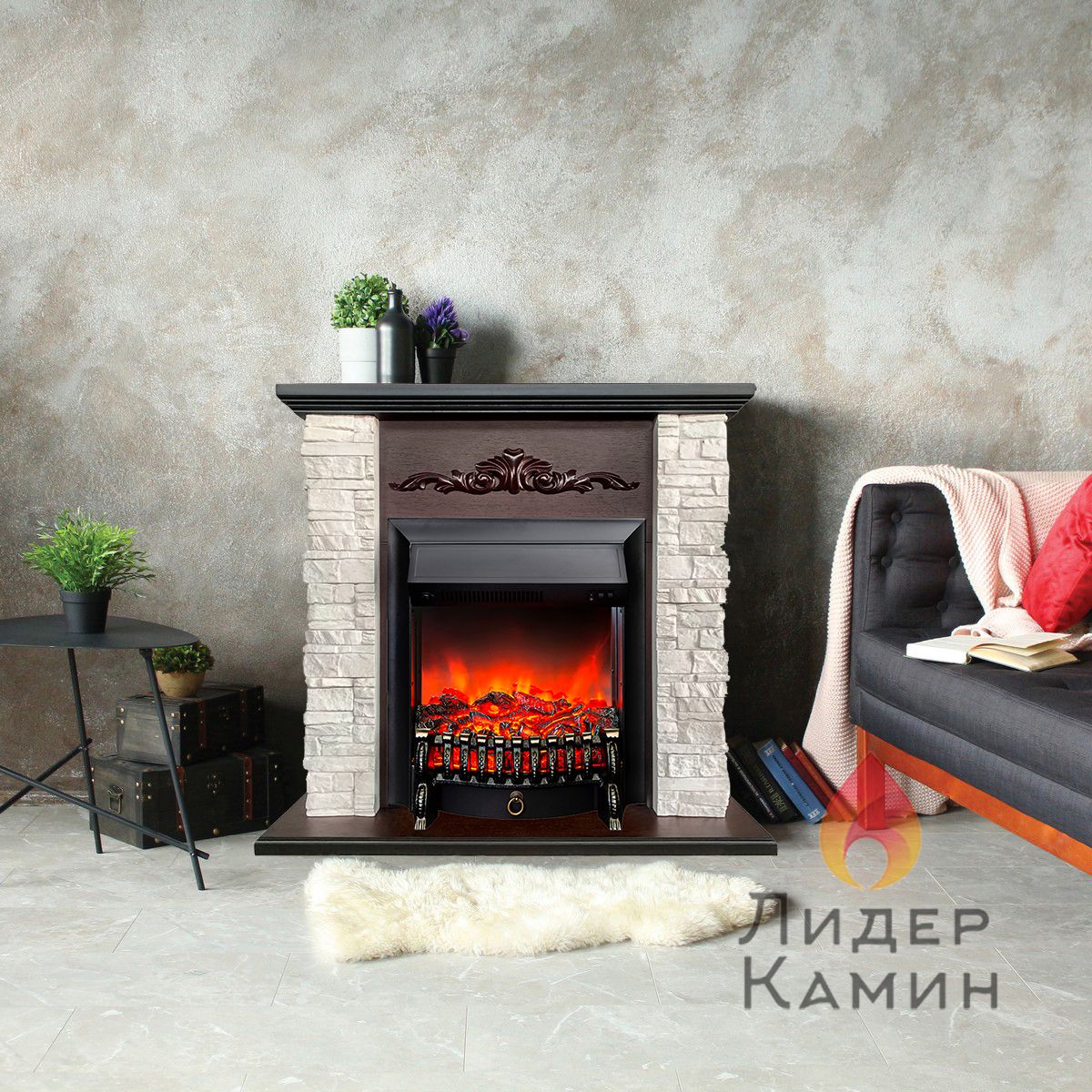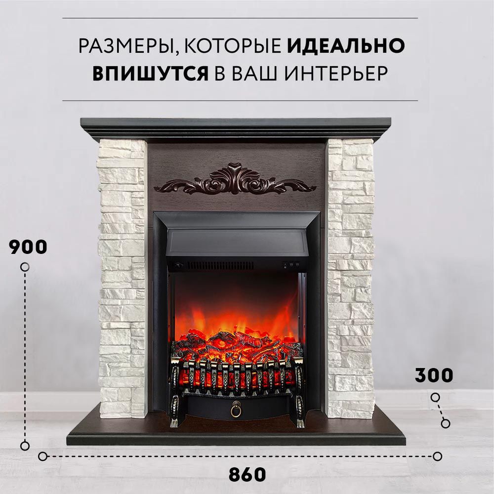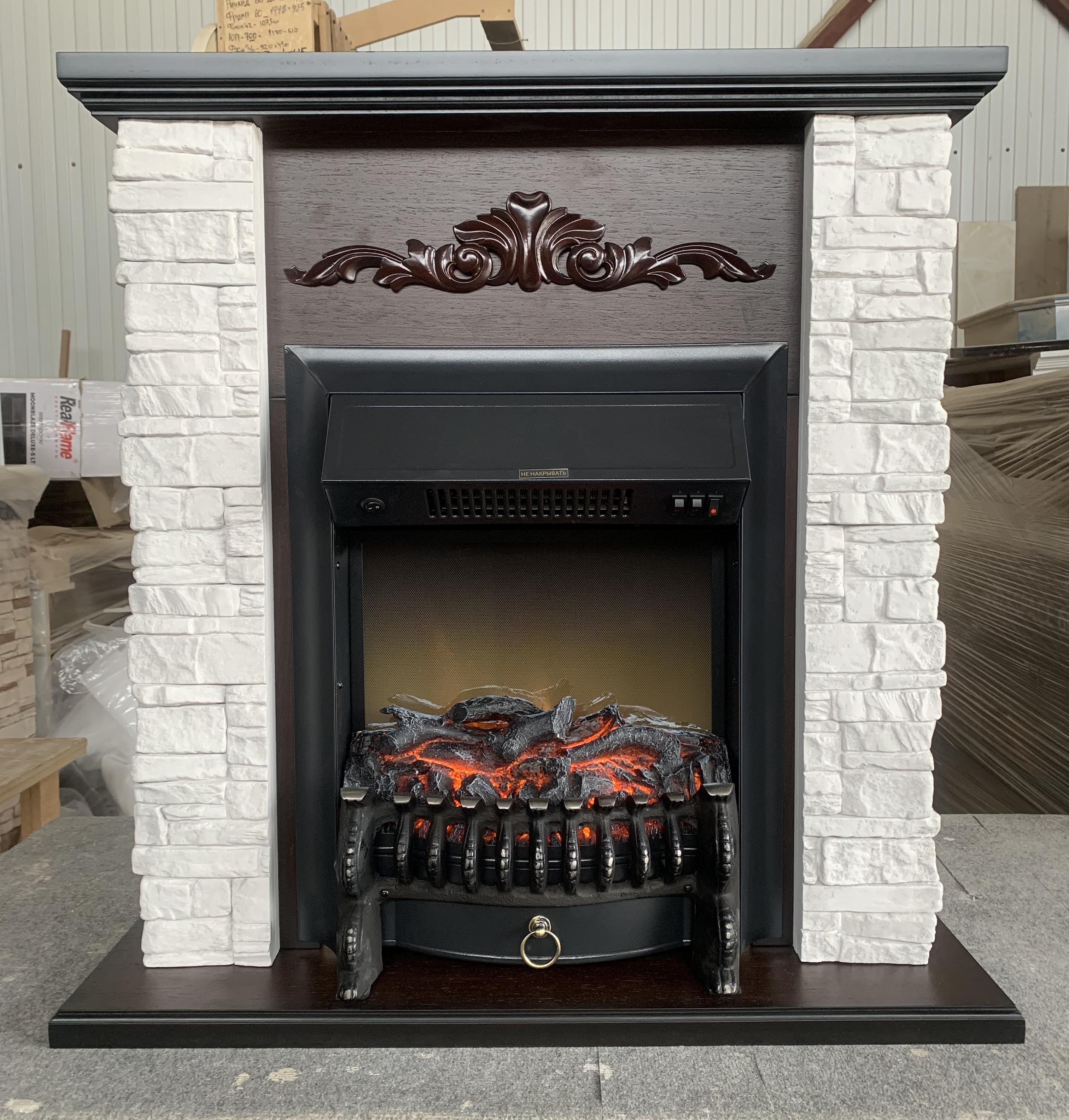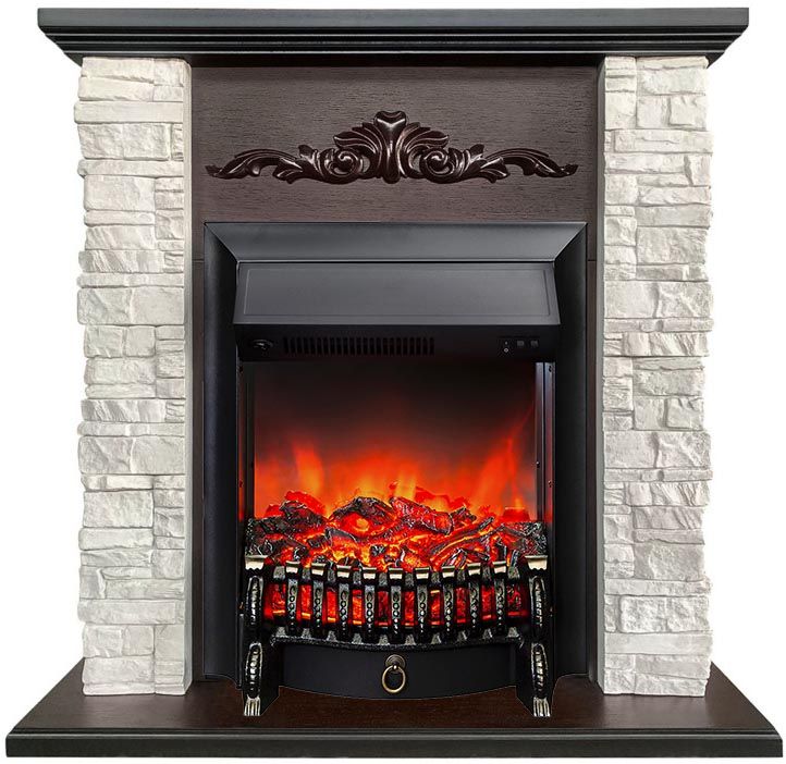 Каминокомплект с такой облицовкой будет прекрасно смотреться как в городском интерьере, так и в загородном доме. Фронтальная часть портала украшена резьбой. Этот электрокамин станет точкой притяжения вашего интерьера.