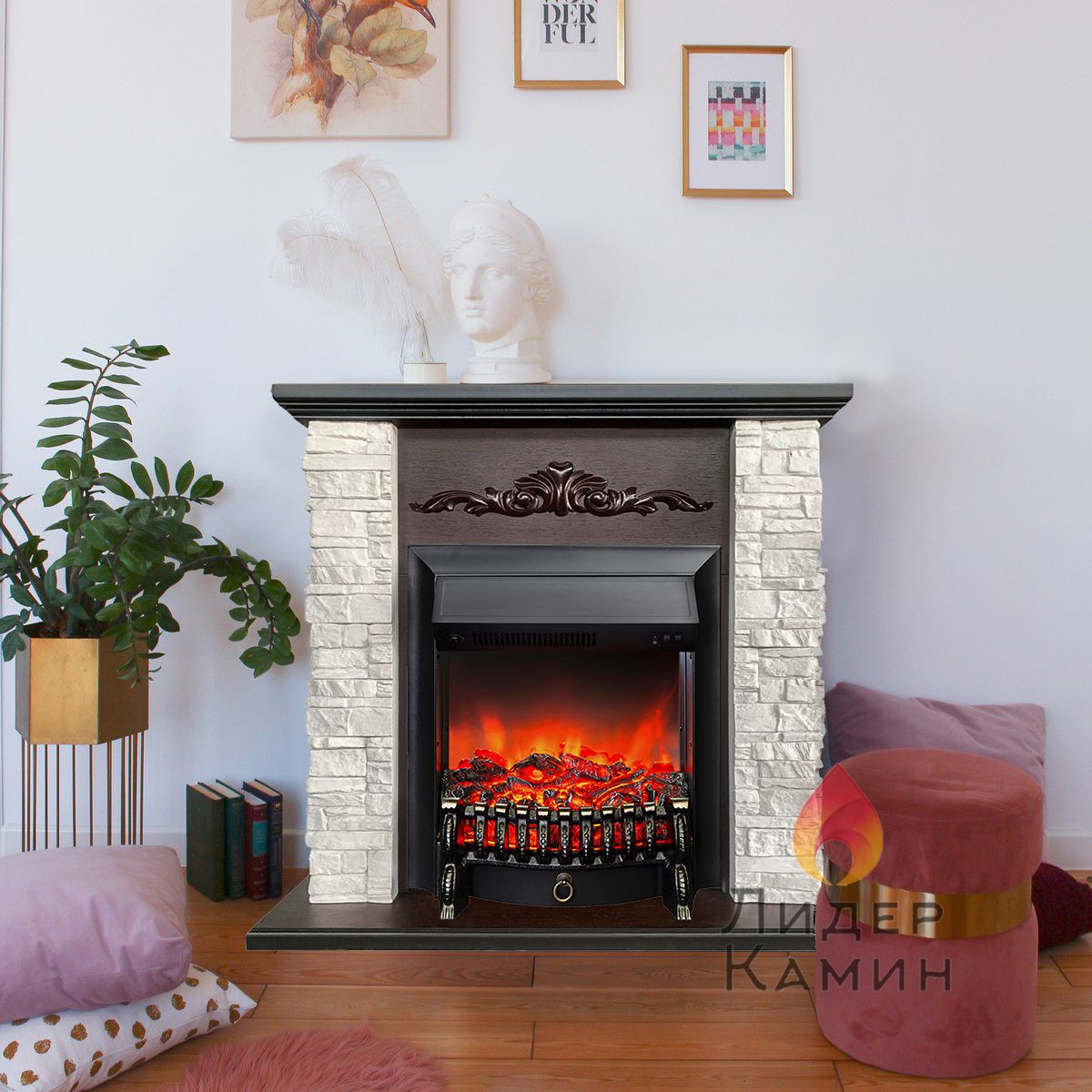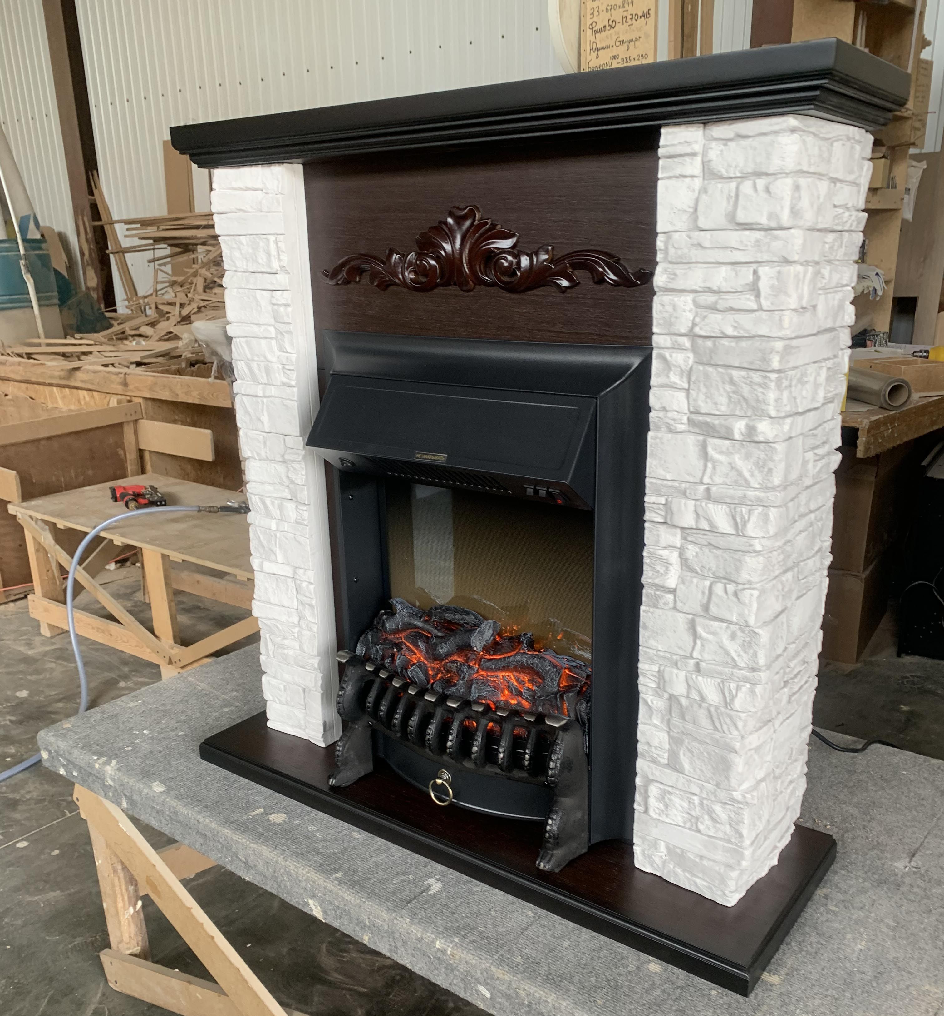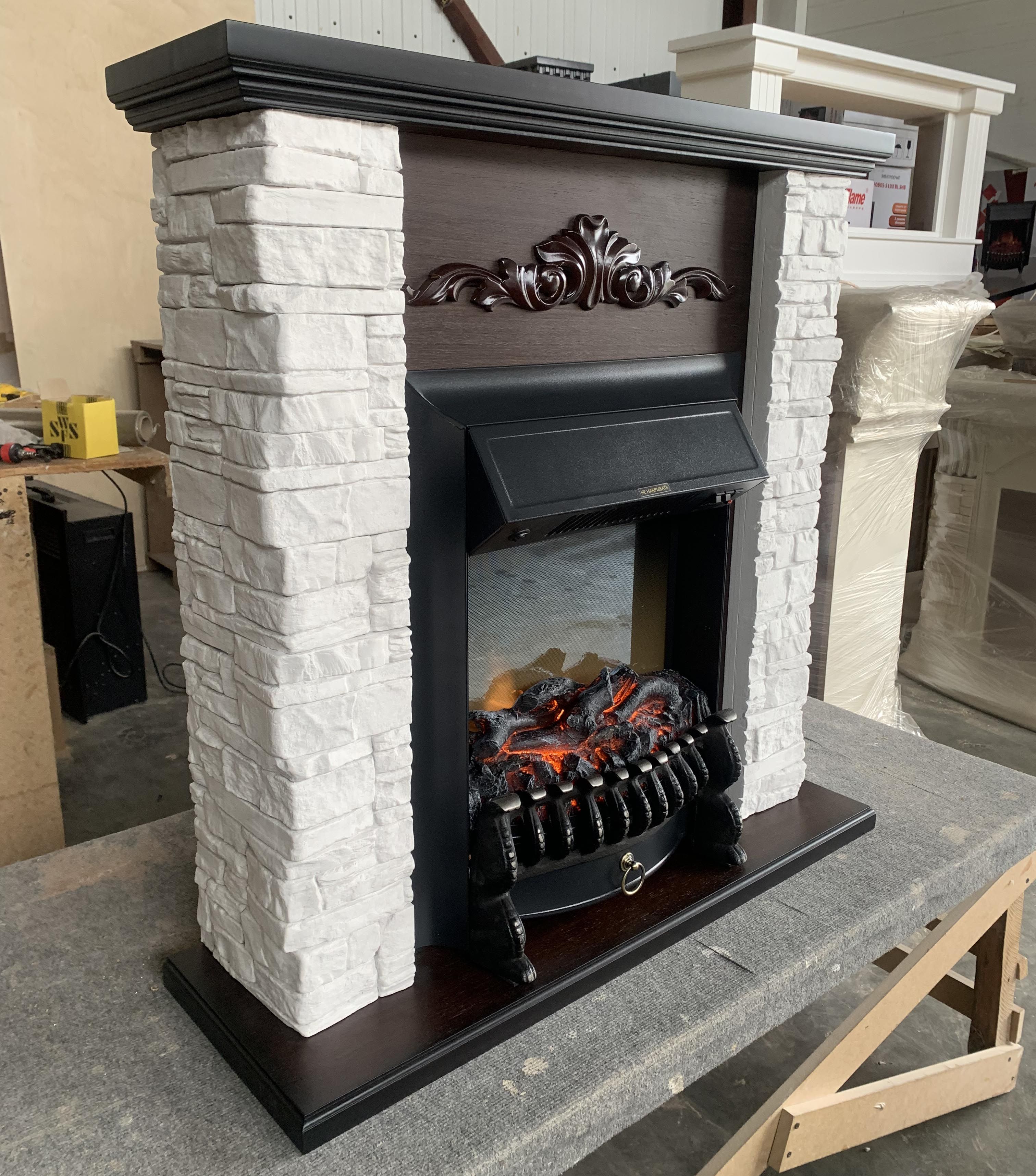 Каминокомплект с такой облицовкой будет прекрасно смотреться как в городском интерьере, так и в загородном доме. Фронтальная часть портала украшена резьбой. Этот электрокамин станет точкой притяжения вашего интерьера.