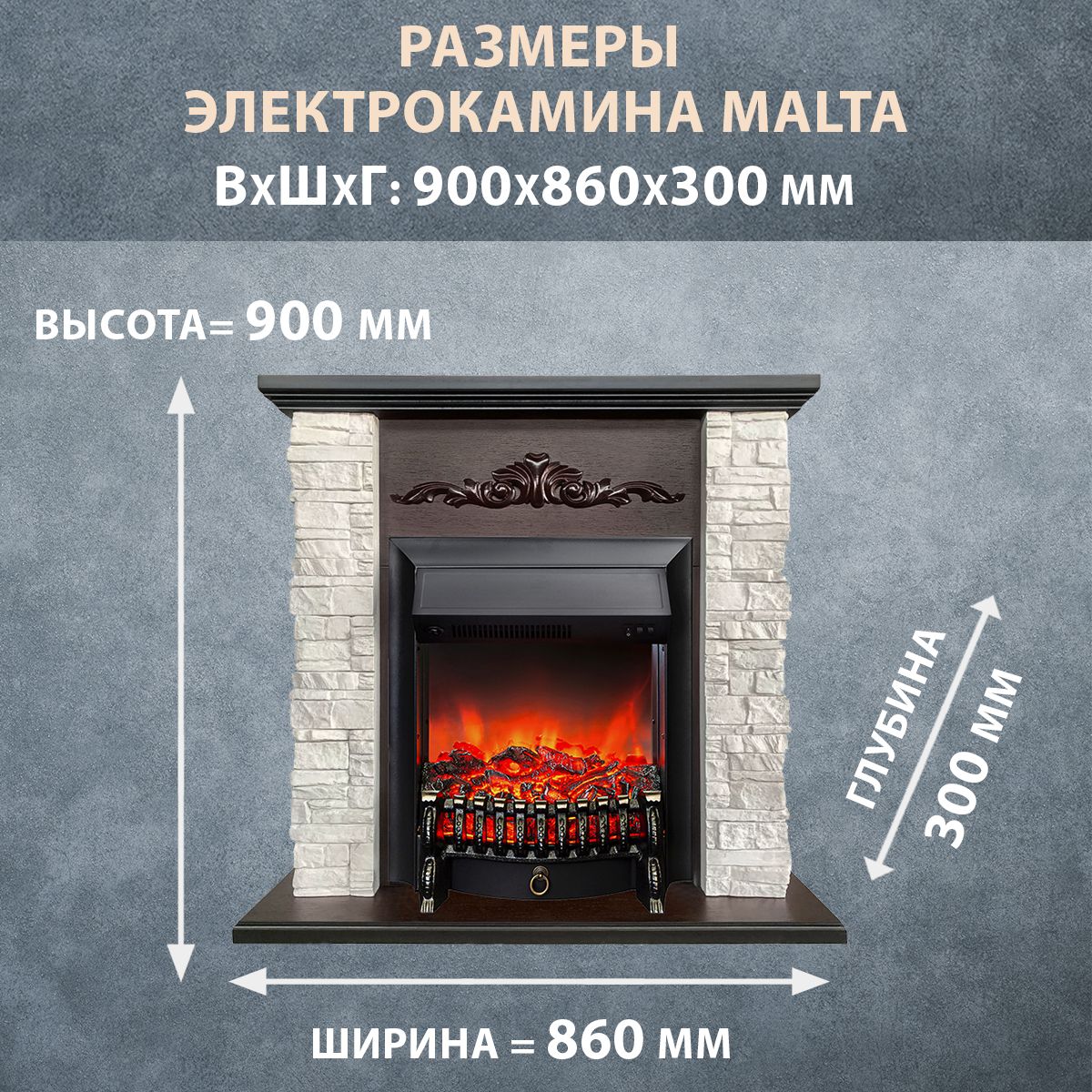 Электрокамин Malta AO белый камень с очагом Fobos изготовлен из шпонированного МДФ в цвете темный дуб и облицован искусственным камнем белого цвета.