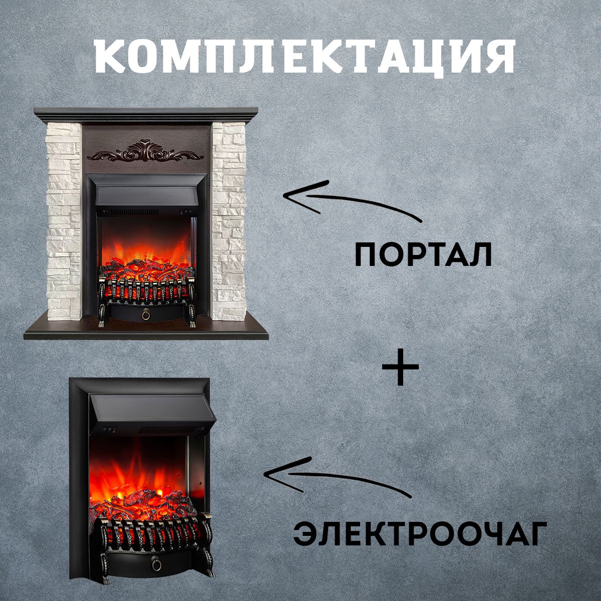 Портал электрокамина укомплектован классическим электроочагом Fobos. В очаге визуальный эффект горящего огня создается с помощью проекционной LED-технологии. Присутствует звуковой эффект горения пламени и потрескивания дров.