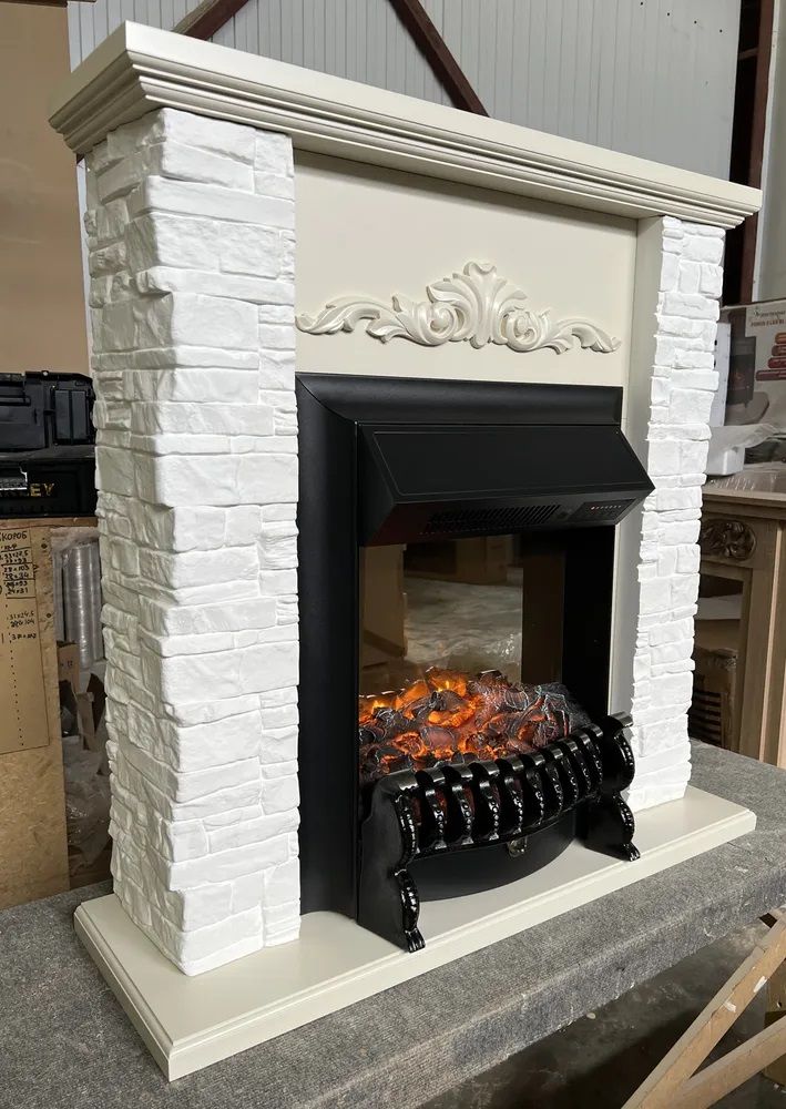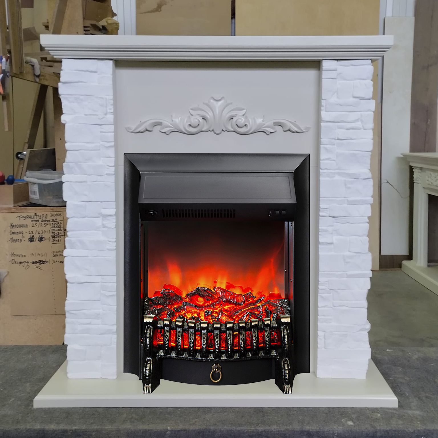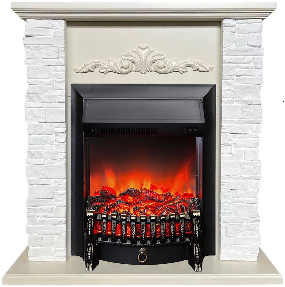 Каминокомплект с такой облицовкой будет прекрасно смотреться как в городском интерьере, так и в загородном доме. Фронтальная часть портала украшена резьбой. Этот электрокамин станет точкой притяжения вашего интерьера.