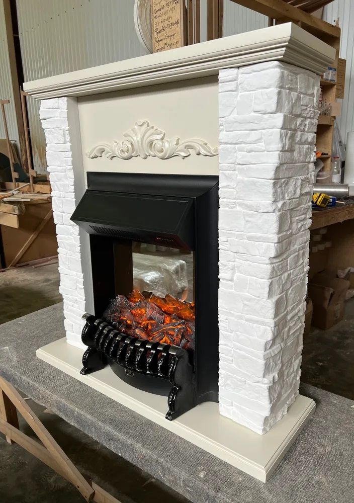 Электрокамин Malta SL белый камень с очагом Fobos изготовлен из шпонированного МДФ в цвете слоновая кость и облицован искусственным камнем белого цвета.