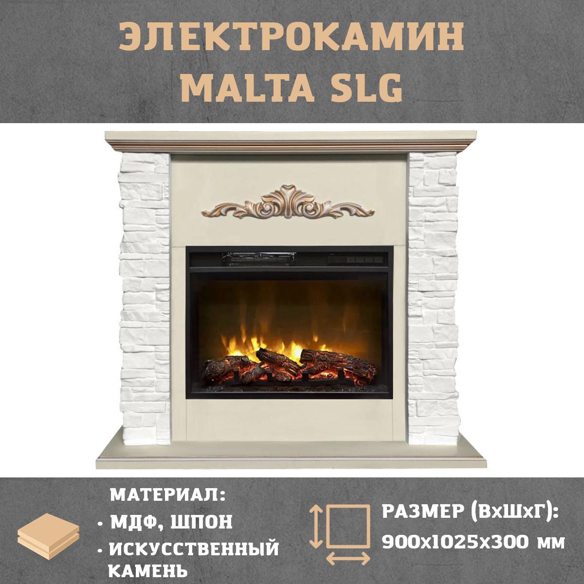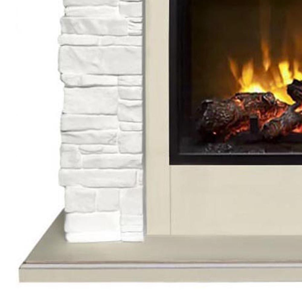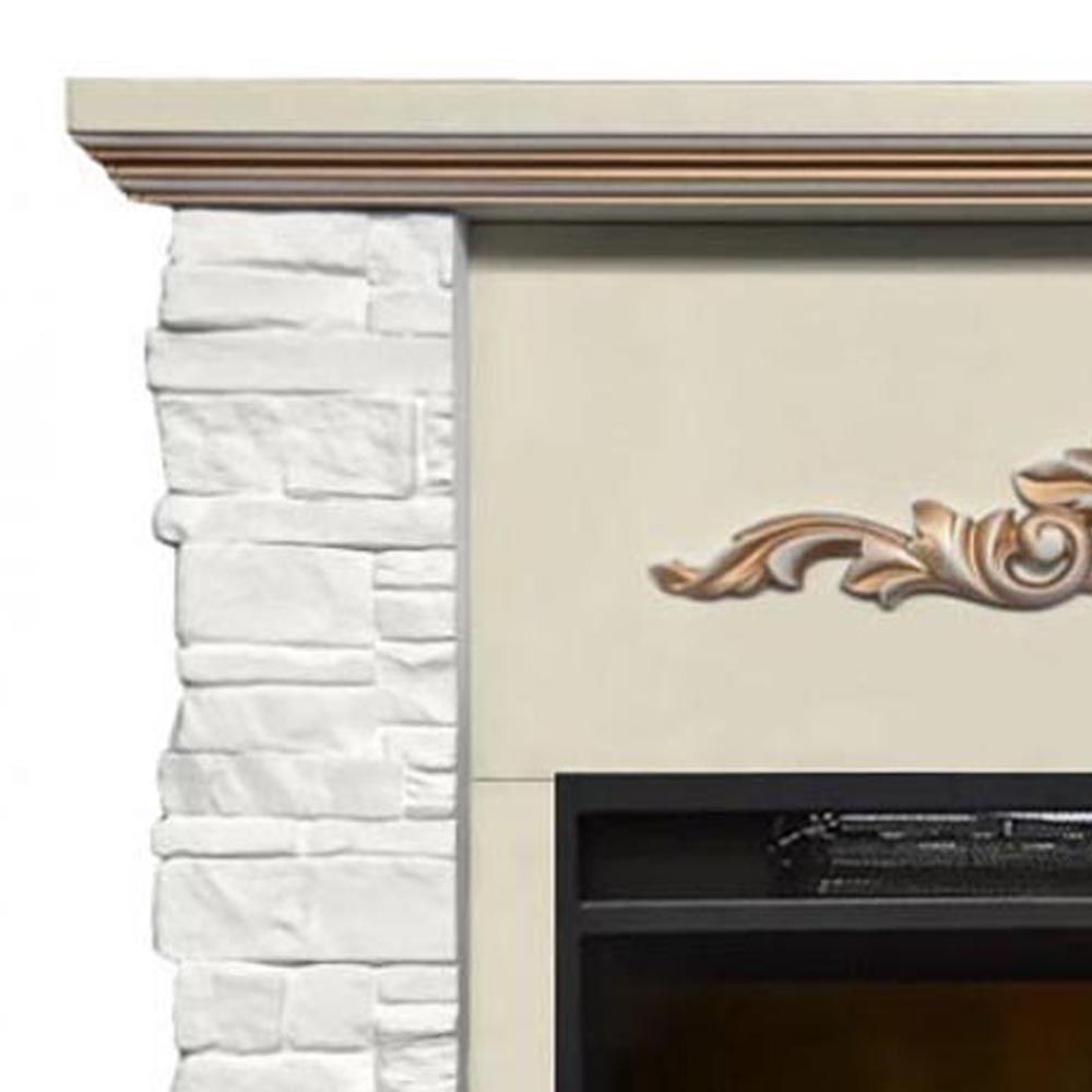 Электрокамин Malta SL белый камень с очагом Magic 24 — изготовлен из шпонированного МДФ в цвете слоновая кость с патиной золото и облицован искусственным камнем белого цвета.