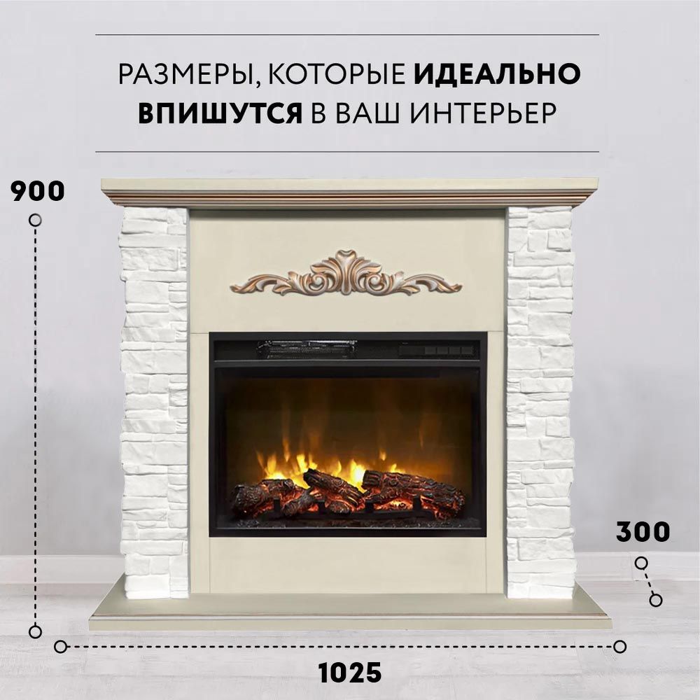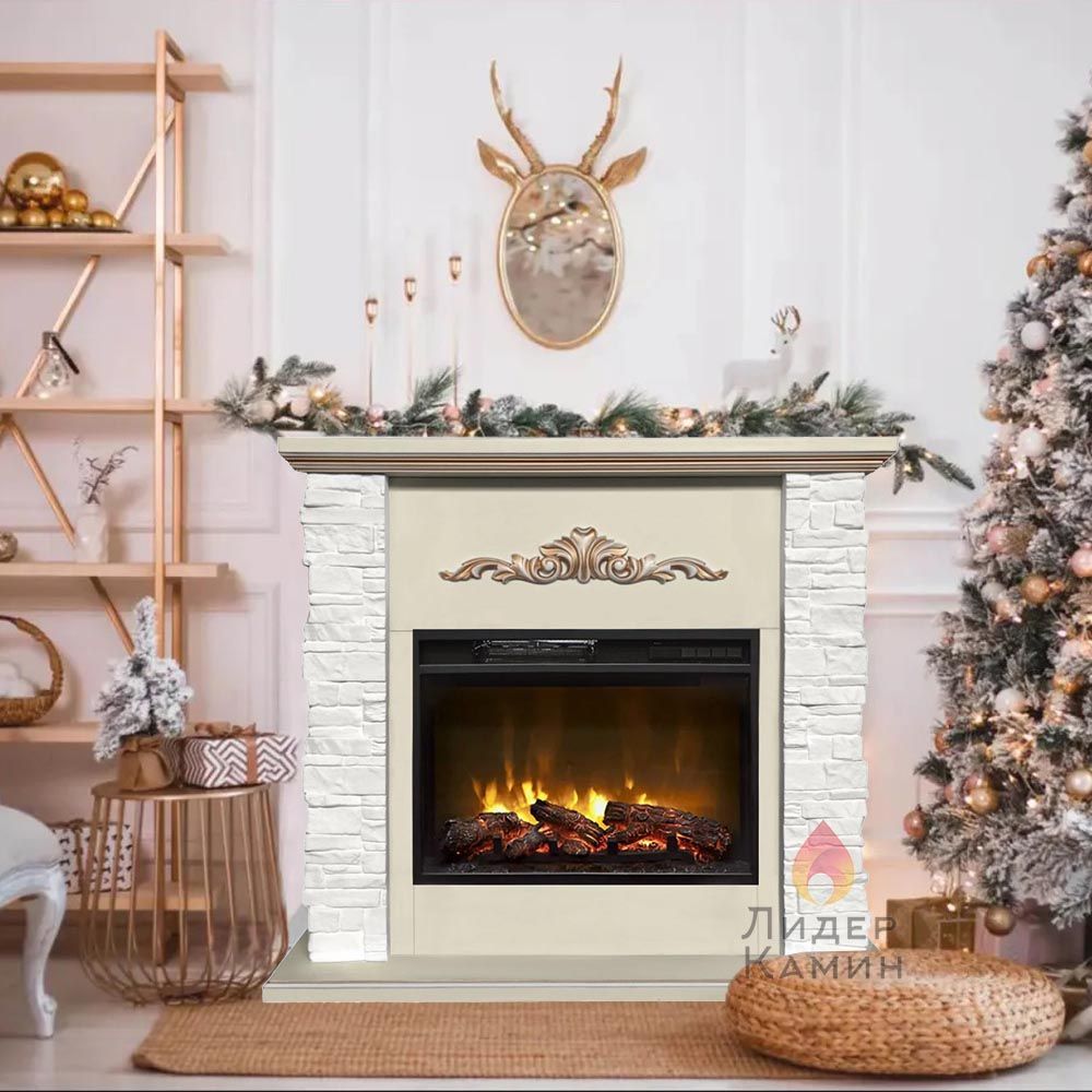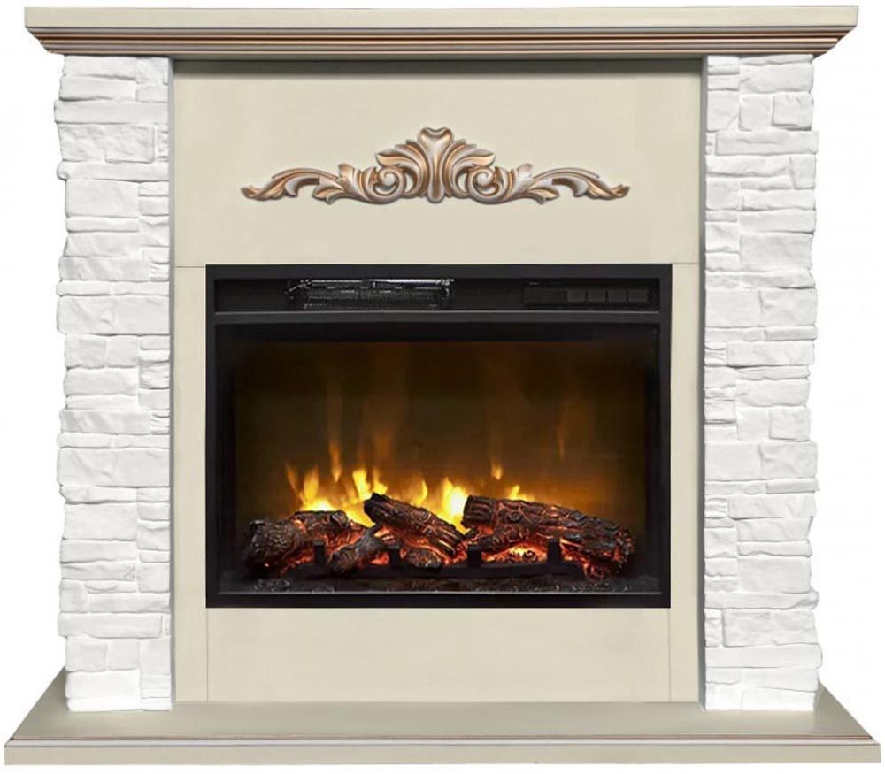 Каминокомплект с такой облицовкой будет прекрасно смотреться как в городском интерьере, так и в загородном доме. Фронтальная часть портала украшена резьбой. Этот электрокамин станет точкой притяжения вашего интерьера.