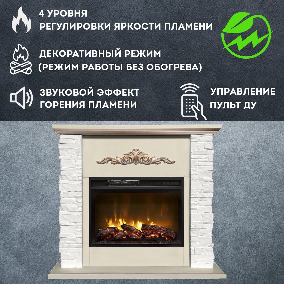 Электрокамин оснащен функцией плавной регулировки яркости пламени, позволяя создавать желаемую атмосферу, а встроенный термостат чутко поддерживает заданную температуру. Таймер отключения позаботится о безопасности и экономии энергии, а многоуровневая защита от перегрева гарантирует спокойствие. Звуковое сопровождение, имитирующее живое потрескивание дров и мерцание пламени, добавляет реалистичности и уюта.
