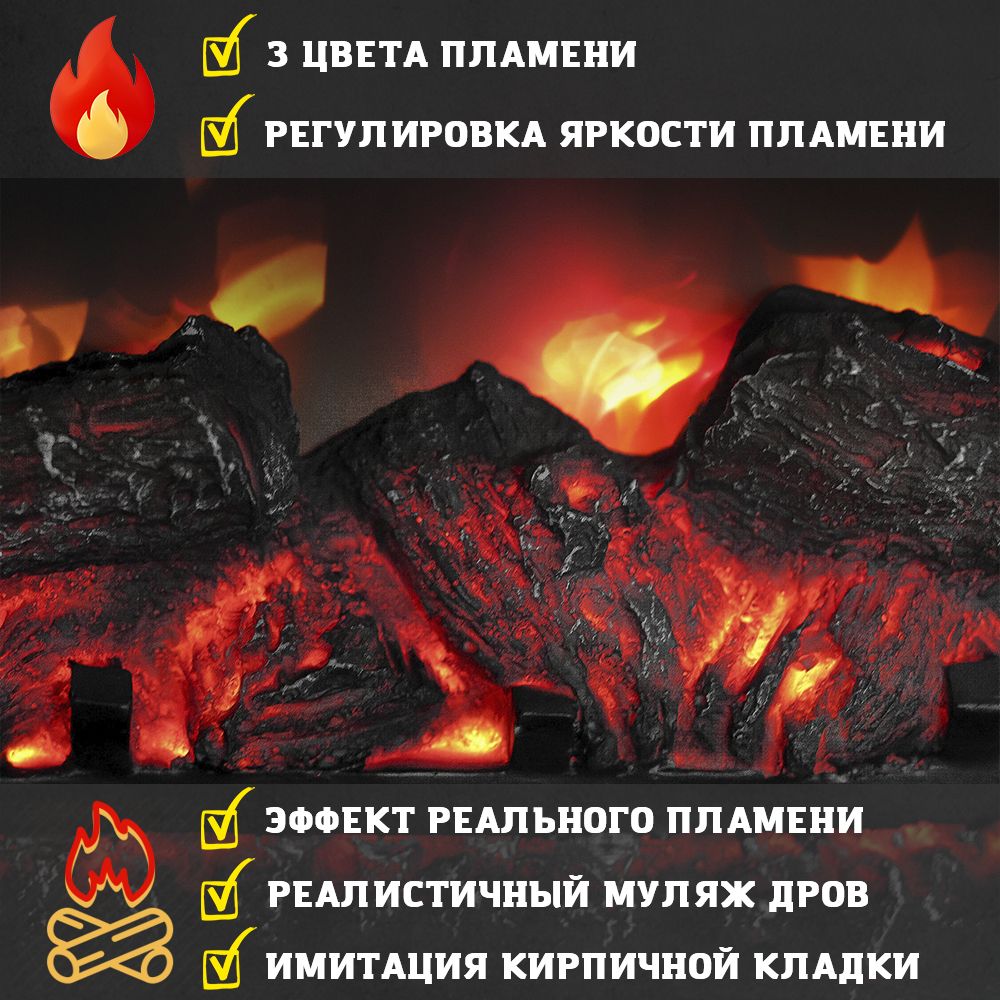 В электрокамине предусмотрена функция регулировки яркости пламени, термостат, таймер отключения и защита от перегрева. Присутствует звуковой эффект горения пламени и потрескивания дров.