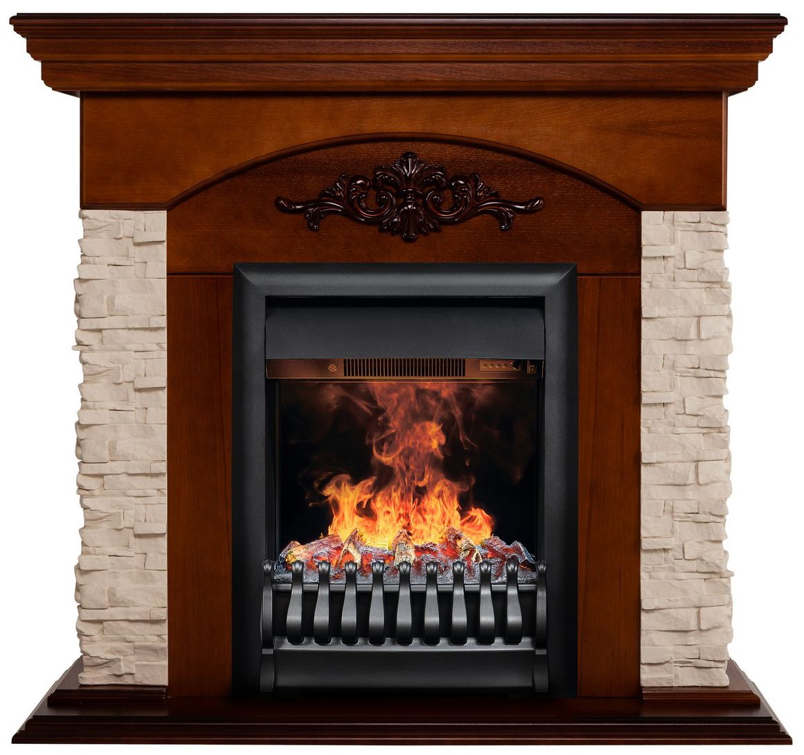 В комплекте используется классический узкий электроочаг 3D Oregan, который оснащен современным эффектом пламени 3D нового поколения. Абсолютно реалистичная имитация пламени, которая выглядит максимально достоверно за счёт эффекта дыма. Эффект пламени притягивает к себе внимание с первых секунд. В очаге реализован один из самых совершенных способов имитации пламени 3D на сегодняшний день. Электроочаг оборудован защитой включения без воды. Присутствует звуковой эффект горения пламени и потрескивания дров. Комплектуется пультом дистанционного управления, с помощью которого регулируется высота и яркость пламени.