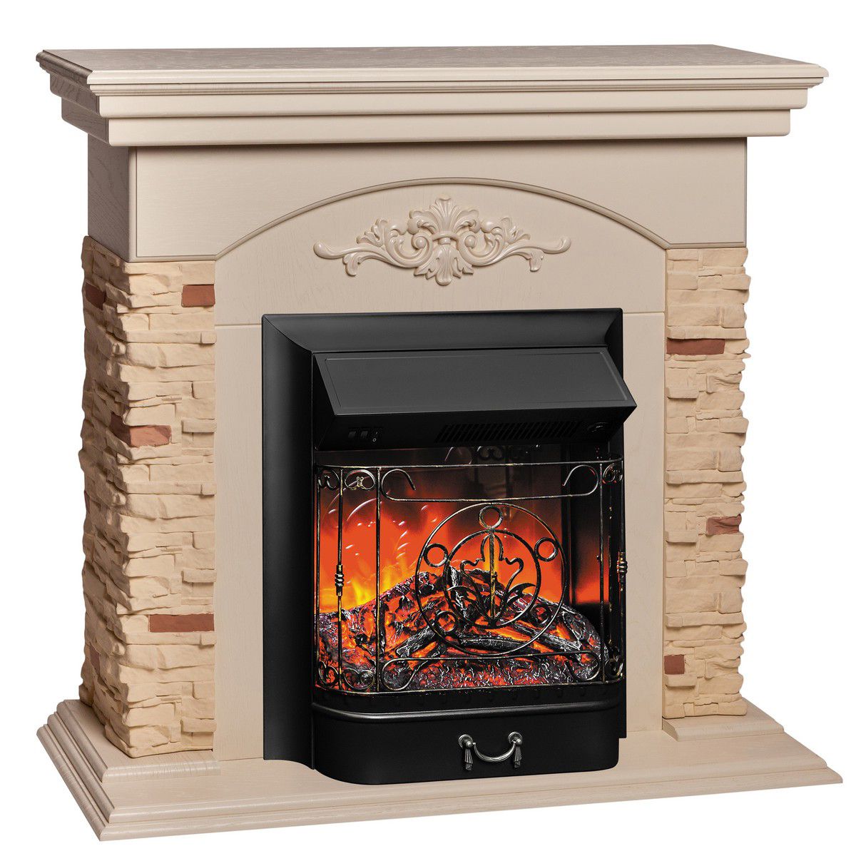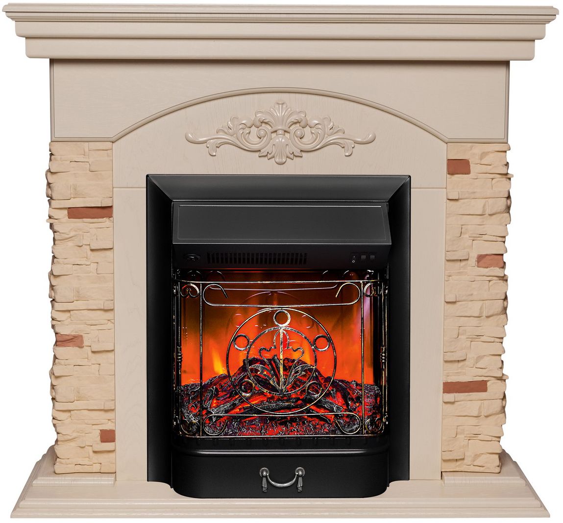 Портал укомплектован классическим электроочагом Majestic. В очаге визуальный эффект горящего огня создается с помощью проекционной LED-технологии. Присутствует звуковой эффект горения пламени и потрескивания дров. Очаг может работать как в режиме обогрева, так и в декоративном режиме без обогрева. В режиме обогрева в очаге предусмотрено 2 уровня регулировки обогрева, возможно переключение мощности обогрева 750-1500 Вт, поэтому в холодные дни данный электрокамин можно использовать как дополнительный источник тепла. Предусмотрена функция защиты от перегрева.