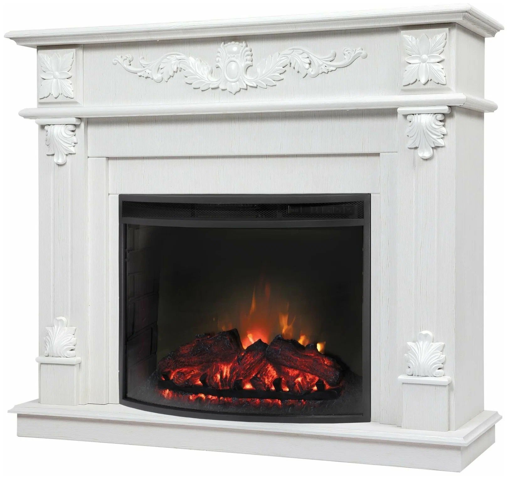 Портал укомплектован широким электроочагом Evrika 25.5 LED с великолепным разноцветным пламенем (3 цвета пламени), пламя в очаге смотрится выразительно и эффектно, а муляж дров и кирпичная кладка создают полное сходство с натуральным очагом. Эффект пламени притягивает к себе внимание с первых секунд. В очаге реализован один из самых совершенных способов визуализации пламени 2D на сегодняшний день. Визуальный эффект горящего огня создается с помощью проекционной LED-технологии.