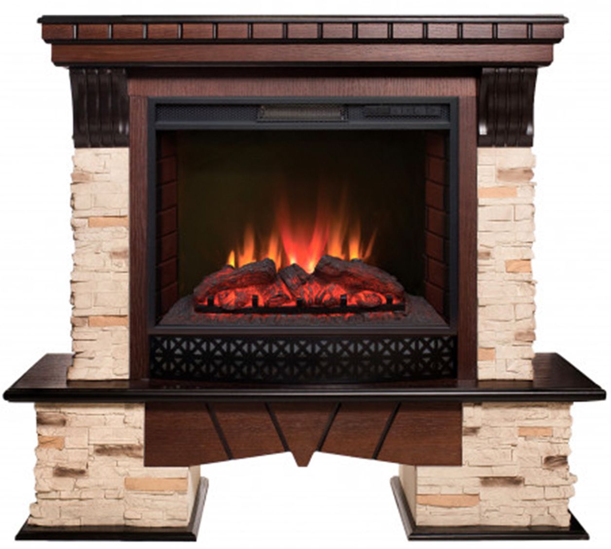 Портал укомплектован широким электроочагом Sparta 25.5 LED с великолепным разноцветным пламенем (3 цвета пламени), пламя в очаге смотрится выразительно и эффектно, а муляж дров и кирпичная кладка создают полное сходство с натуральным очагом. Эффект пламени притягивает к себе внимание с первых секунд. В очаге реализован один из самых совершенных способов визуализации пламени 2D на сегодняшний день. Визуальный эффект горящего огня создается с помощью проекционной LED-технологии.