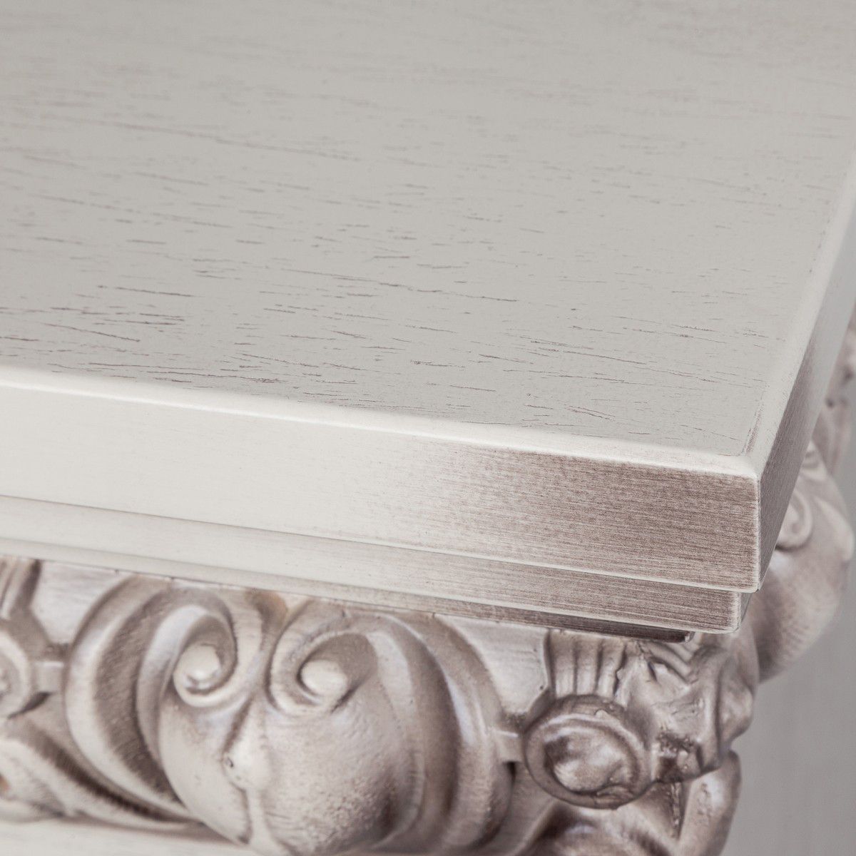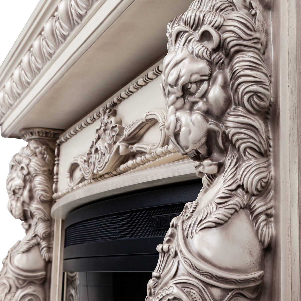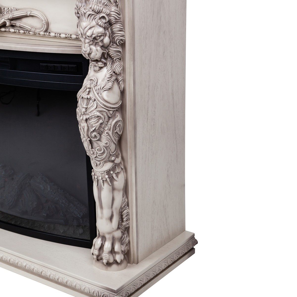 Электрокамин Romano WT с очагом 3D FireStar 33 изготовлен из шпонированного МДФ в стиле барокко, в цвете "беленый дуб". Красивый серо-молочный цвет с патинированием. Стильный электрокамин Romano инкрустированный львами по колоннам. Украшен резьбой по дереву.