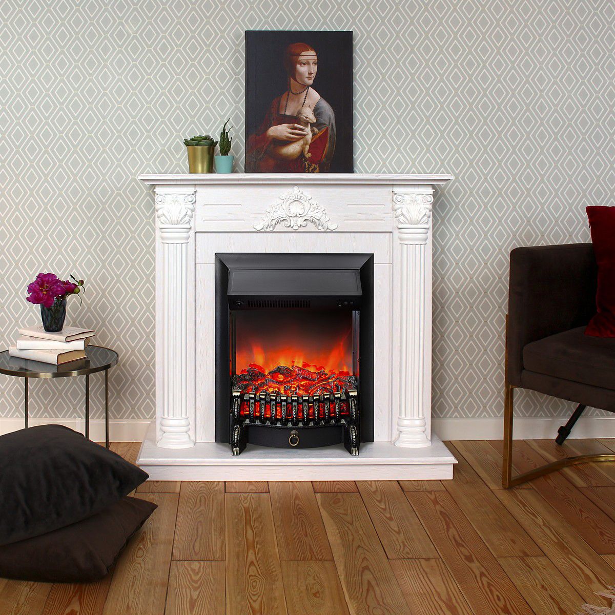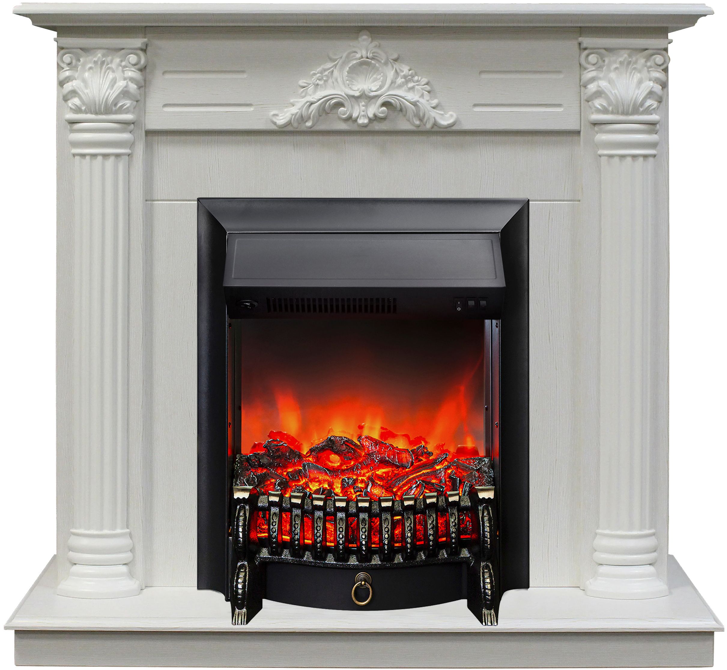 Портал укомплектован классическим электроочагом Fobos. В очаге визуальный эффект горящего огня создается с помощью проекционной LED-технологии. Присутствует звуковой эффект горения пламени и потрескивания дров. Очаг может работать как в режиме обогрева, так и в декоративном режиме без обогрева. В режиме обогрева в очаге предусмотрено 2 уровня регулировки обогрева, возможно переключение мощности обогрева 750-1500 Вт, поэтому в холодные дни данный электрокамин можно использовать как дополнительный источник тепла. Предусмотрена функция защиты от перегрева.