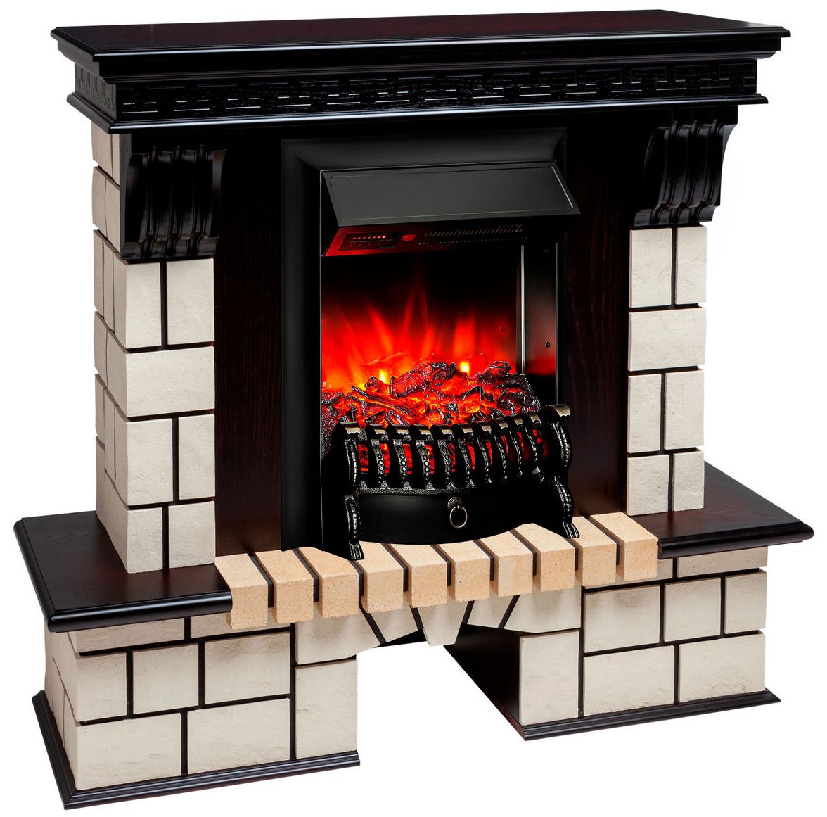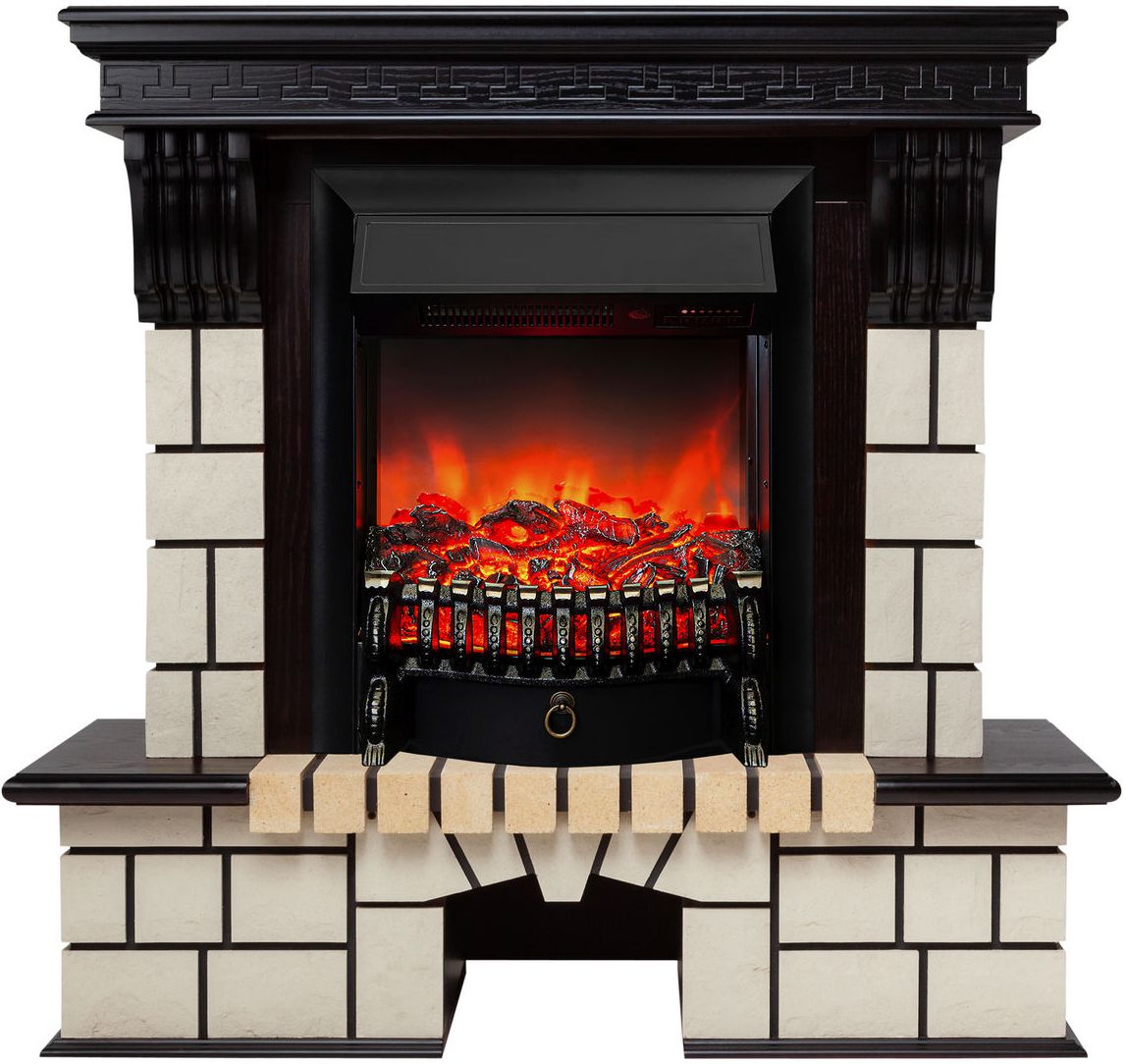 Портал укомплектован классическим электроочагом Fobos. В очаге визуальный эффект горящего огня создается с помощью проекционной LED-технологии. Присутствует звуковой эффект горения пламени и потрескивания дров. Очаг может работать как в режиме обогрева, так и в декоративном режиме без обогрева. В режиме обогрева в очаге предусмотрено 2 уровня регулировки обогрева, возможно переключение мощности обогрева 750-1500 Вт, поэтому в холодные дни данный электрокамин можно использовать как дополнительный источник тепла. Предусмотрена функция защиты от перегрева.