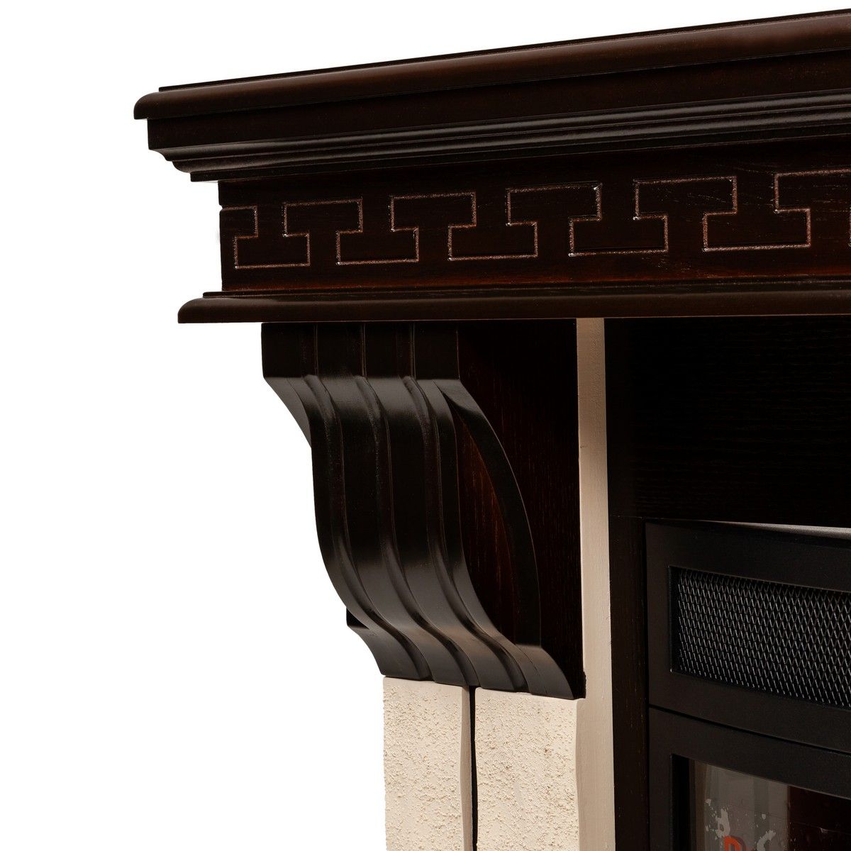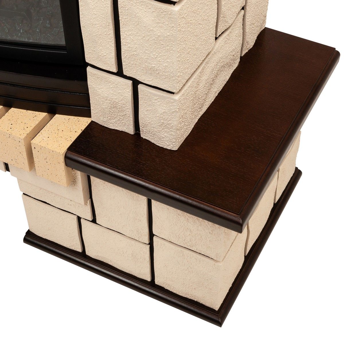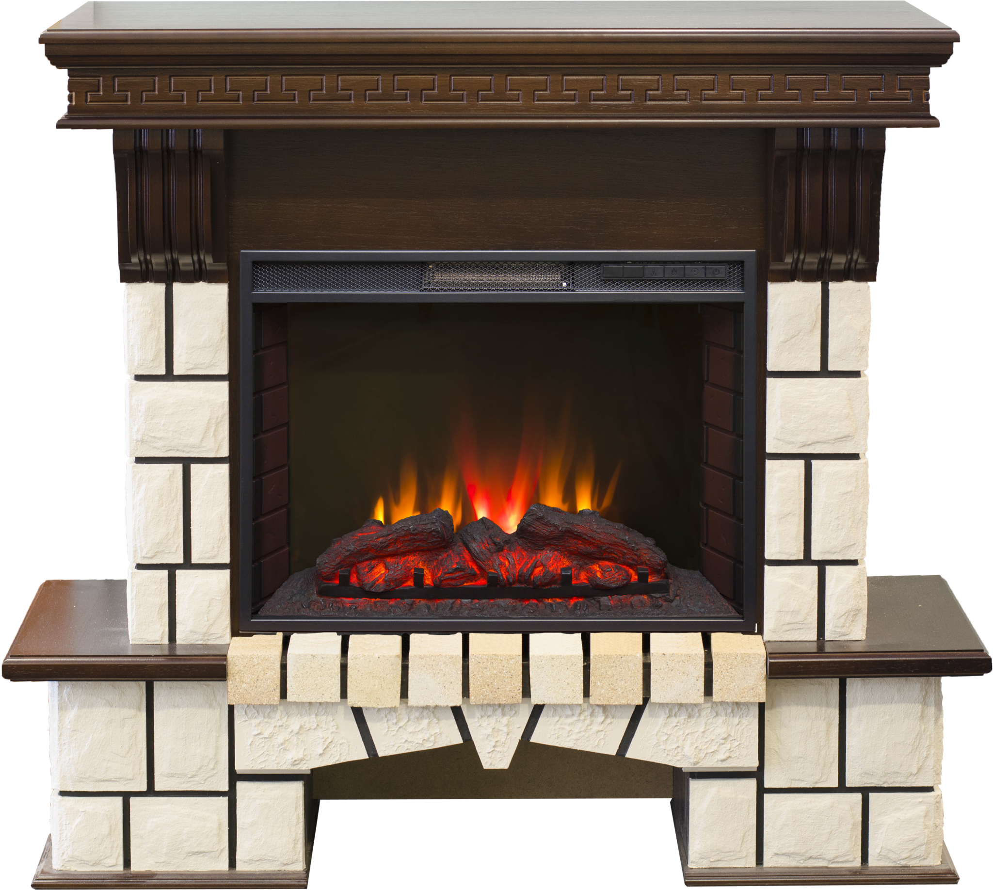 Портал укомплектован широким электроочагом Sparta 25.5 LED с великолепным разноцветным пламенем (3 цвета пламени), пламя в очаге смотрится выразительно и эффектно, а муляж дров и кирпичная кладка создают полное сходство с натуральным очагом. Эффект пламени притягивает к себе внимание с первых секунд. В очаге реализован один из самых совершенных способов визуализации пламени 2D на сегодняшний день. Визуальный эффект горящего огня создается с помощью проекционной LED-технологии.