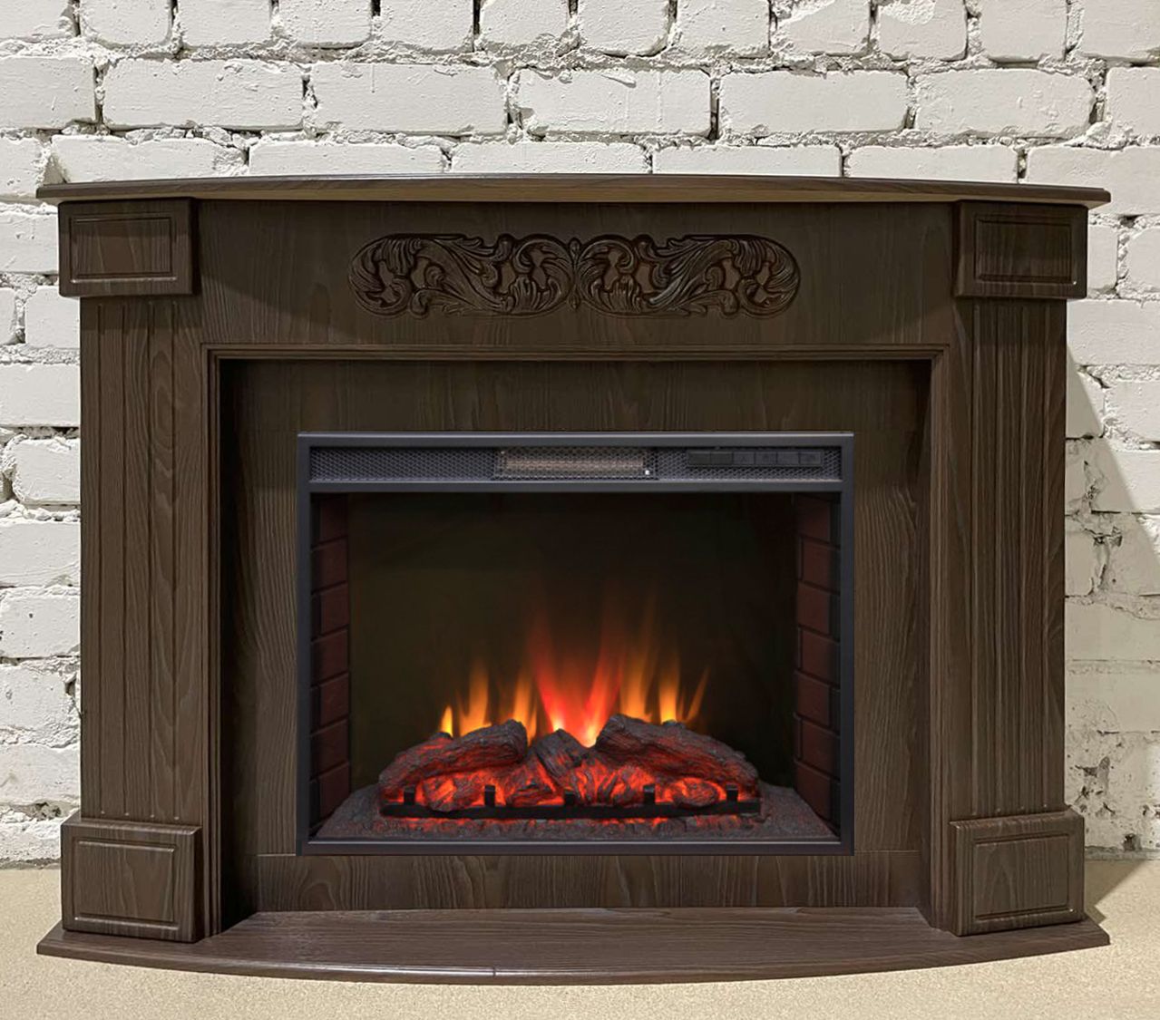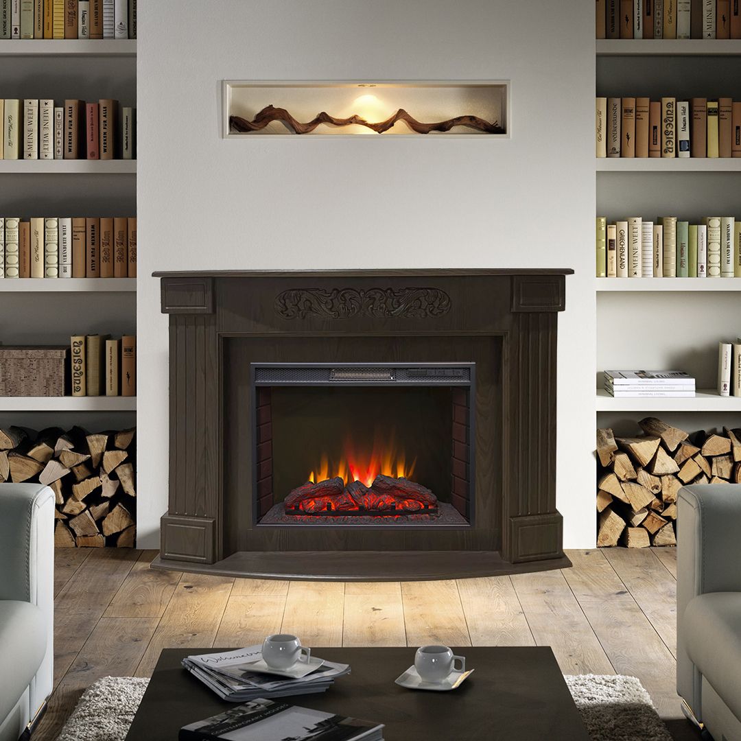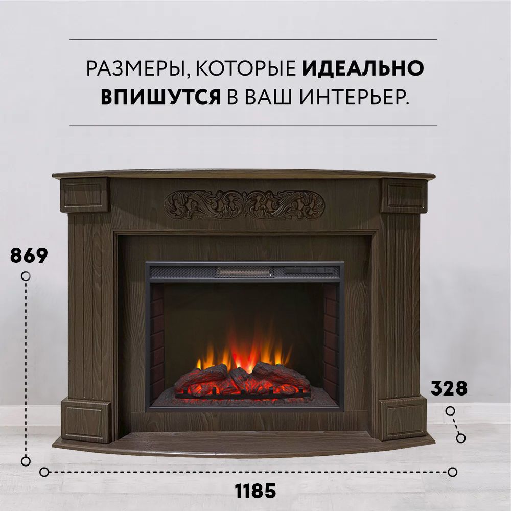 Портал укомплектован широким электроочагом Sparta 25.5 LED с великолепным разноцветным пламенем (3 цвета пламени), пламя в очаге смотрится выразительно и эффектно, а муляж дров и кирпичная кладка создают полное сходство с натуральным очагом. Эффект пламени притягивает к себе внимание с первых секунд. В очаге реализован один из самых совершенных способов визуализации пламени 2D на сегодняшний день. Визуальный эффект горящего огня создается с помощью проекционной LED-технологии.