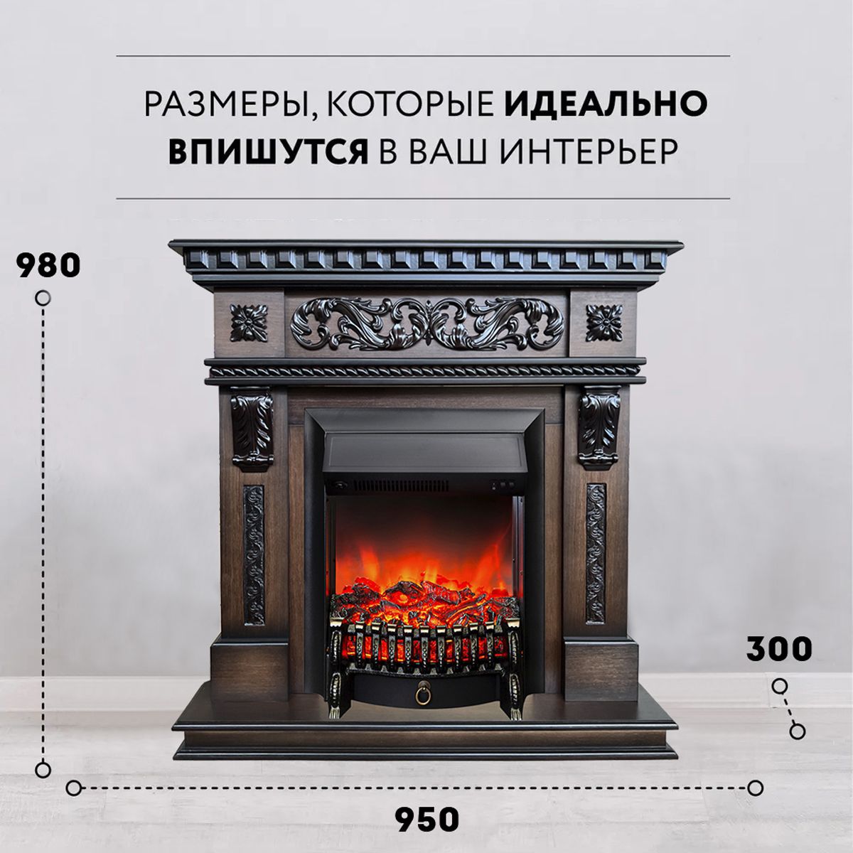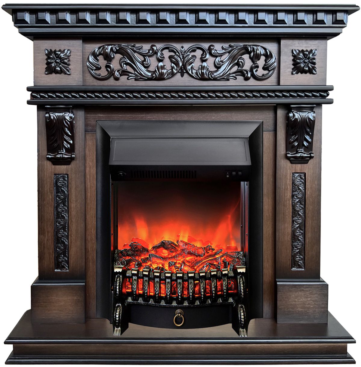 Электрокамин Verona AO с очагом Fobos выполнен в классическом стиле и оформлен декоративной отделкой. Изготовлен из МДФ и натурального шпона в цвете дуб тёмный.