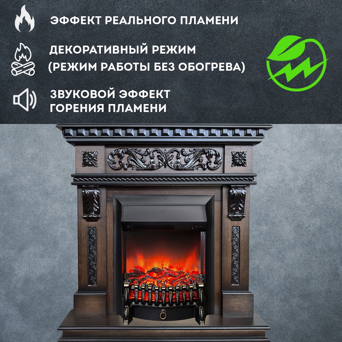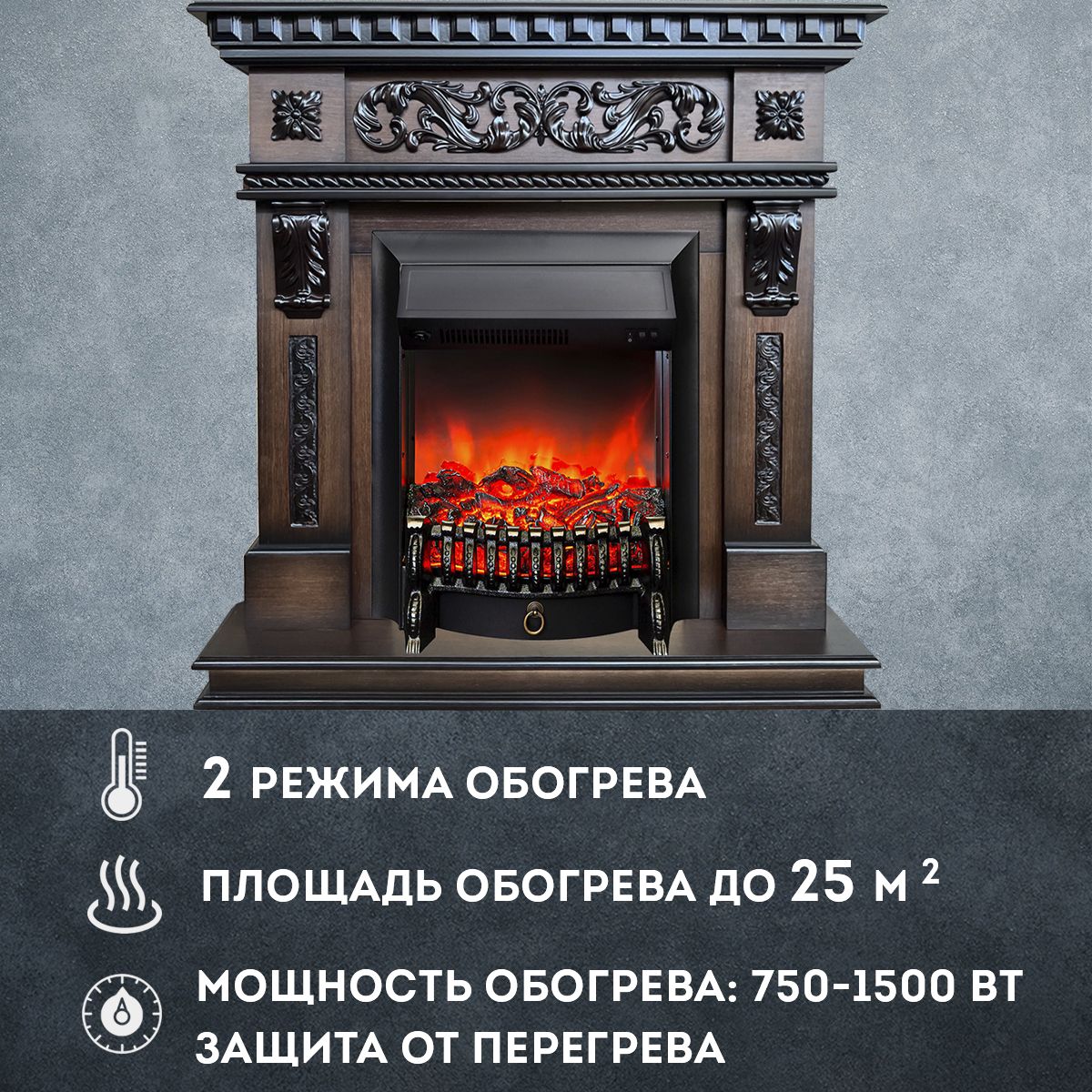 Электрический камин может работать как в режиме обогрева, так и в декоративном режиме без обогрева. В режиме обогрева в электрокамине предусмотрено 2 уровня регулировки обогрева, возможно переключение мощности обогрева 750-1500 Вт, поэтому в холодные дни данный электрокамин можно использовать как дополнительный источник тепла. Предусмотрена функция защиты от перегрева.