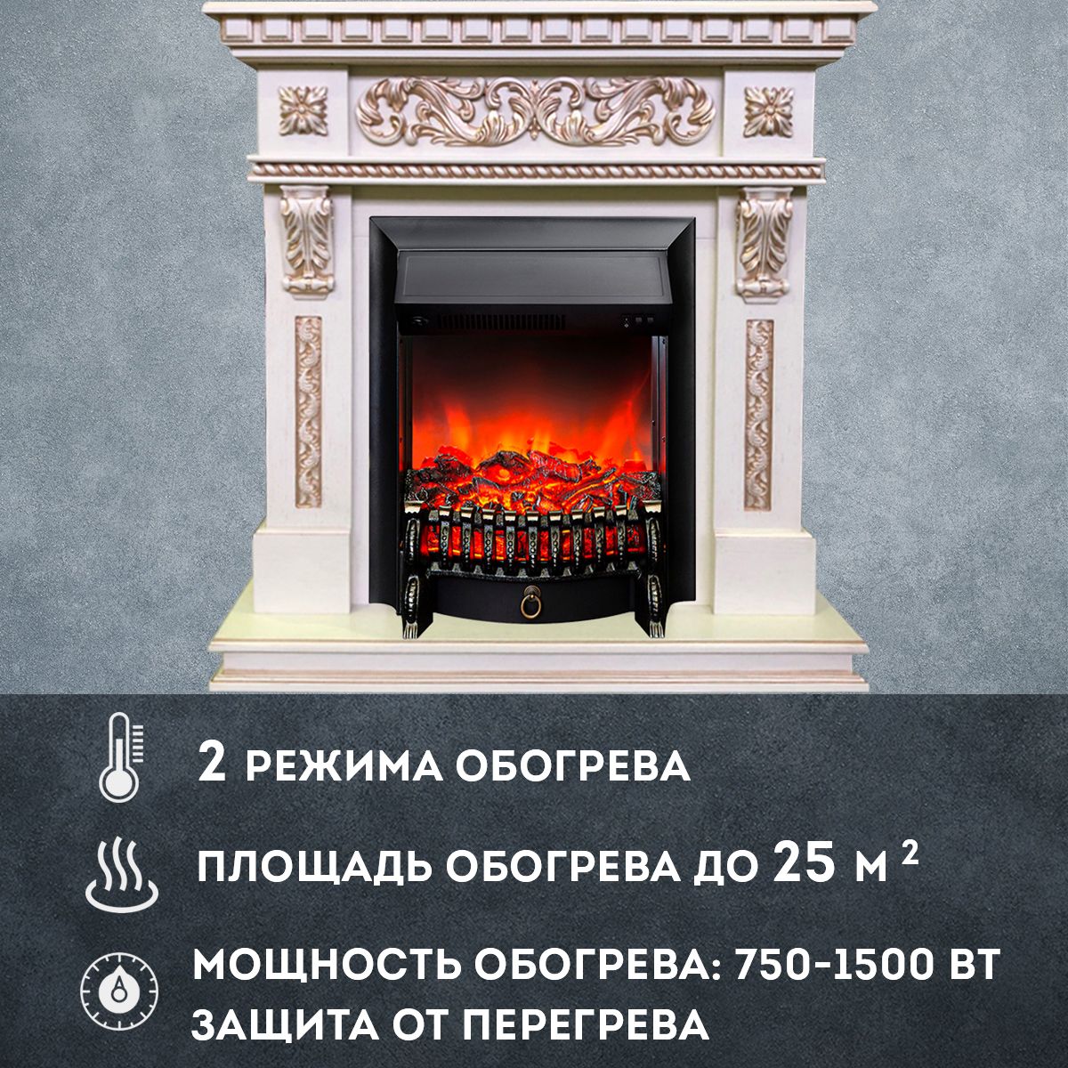 Каминокомплект может работать как в режиме обогрева, так и в декоративном режиме без обогрева. В режиме обогрева в электрокамине предусмотрено 2 уровня регулировки обогрева, возможно переключение мощности обогрева 750-1500 Вт, поэтому в холодные дни данный электрокамин можно использовать как дополнительный источник тепла. Предусмотрена функция защиты от перегрева.