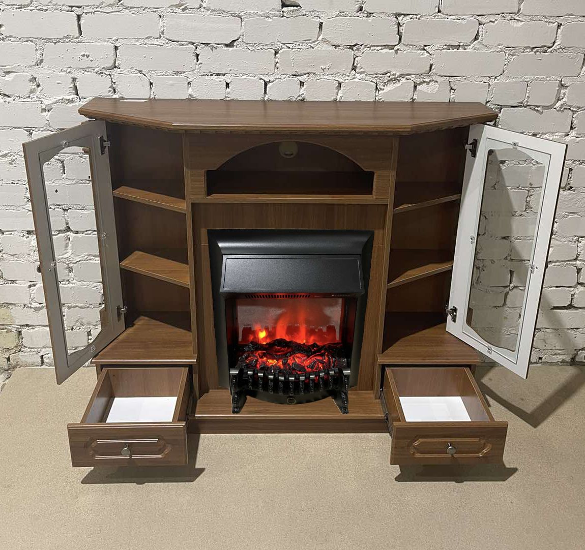 Электрокамин Вилс NT с очагом Fobos изготовлен из МДФ и ЛДСП, много-функциональный дизайн, строгий ретростиль. Комплектация ящиками полного выдвижения по обе стороны портала. Открывающиеся рамочные фасады с прозрачным стеклом на петлях с доводчиком. Полки ЛДСП. Заглушка под провода. Инструкция по сборке.