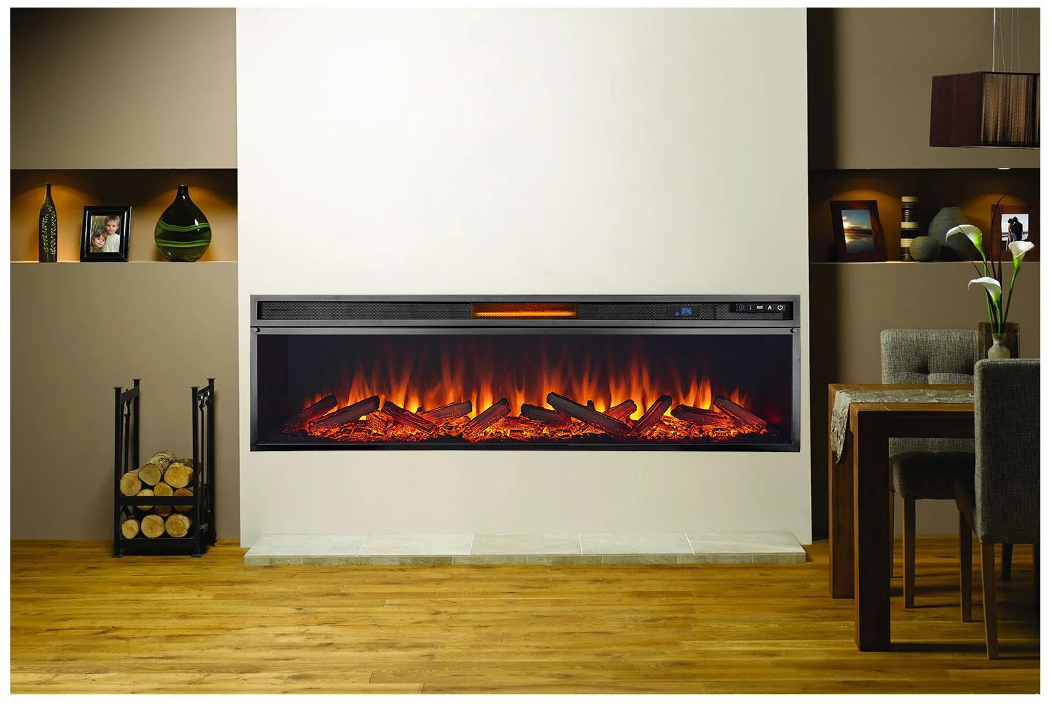Линейный электроочаг Vision 60 LOG LED – это современный широкоформатный электрический очаг. Его размер составляет 425х1461х210 мм, а встраиваемые размеры: 412х1435х190 мм. Он может устанавливаться как отдельно без каминного портала, также встраиваться в нишу или каминный портал.
