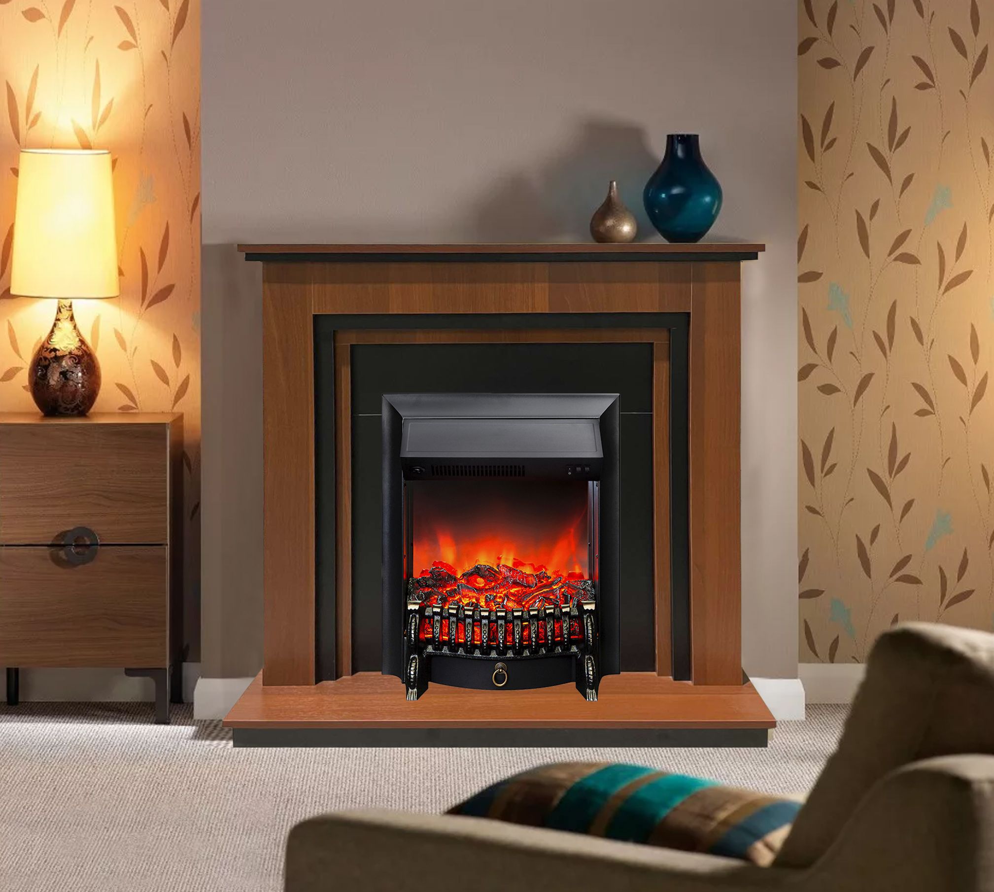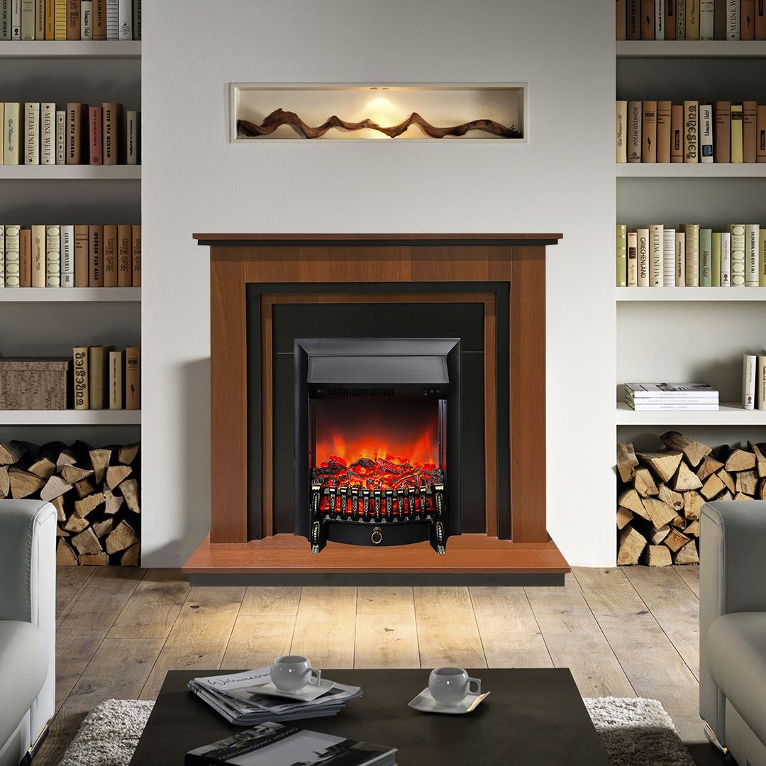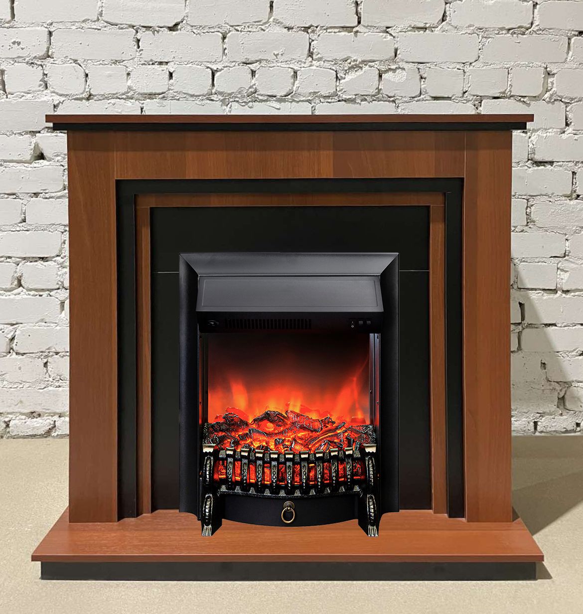 Портал укомплектован классическим электроочагом Fobos. В очаге визуальный эффект горящего огня создается с помощью проекционной LED-технологии. Присутствует звуковой эффект горения пламени и потрескивания дров. Очаг может работать как в режиме обогрева, так и в декоративном режиме без обогрева. В режиме обогрева в очаге предусмотрено 2 уровня регулировки обогрева, возможно переключение мощности обогрева 750-1500 Вт, поэтому в холодные дни данный электрокамин можно использовать как дополнительный источник тепла. Предусмотрена функция защиты от перегрева.