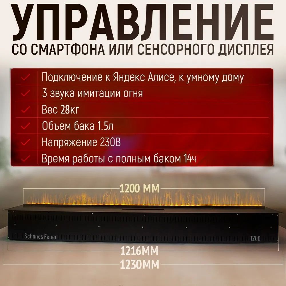 Особенностью данного электроочага 3D FireLine 1200 является возможность управления им при помощи смартфона, установив специальное приложение "3D FIRELINE", которое разработано как для Android, так и для IOS, а также голосовым управлением Яндекс Алисой. Есть также сенсорное управление и пульт ДУ. Вы легко можете настроить основные функции электроочага: регулировать высоту, густоту и скорость поднятия пламени, есть 3 режима звукового эффекта горения пламени и потрескивания дров. Светодиодная подсветка воссоздаёт реалистичную имитацию огня с розово-синим оттенком, даря чувство безмятежности и расслабления от созерцания пламени.
